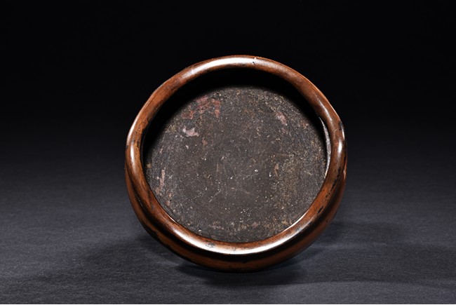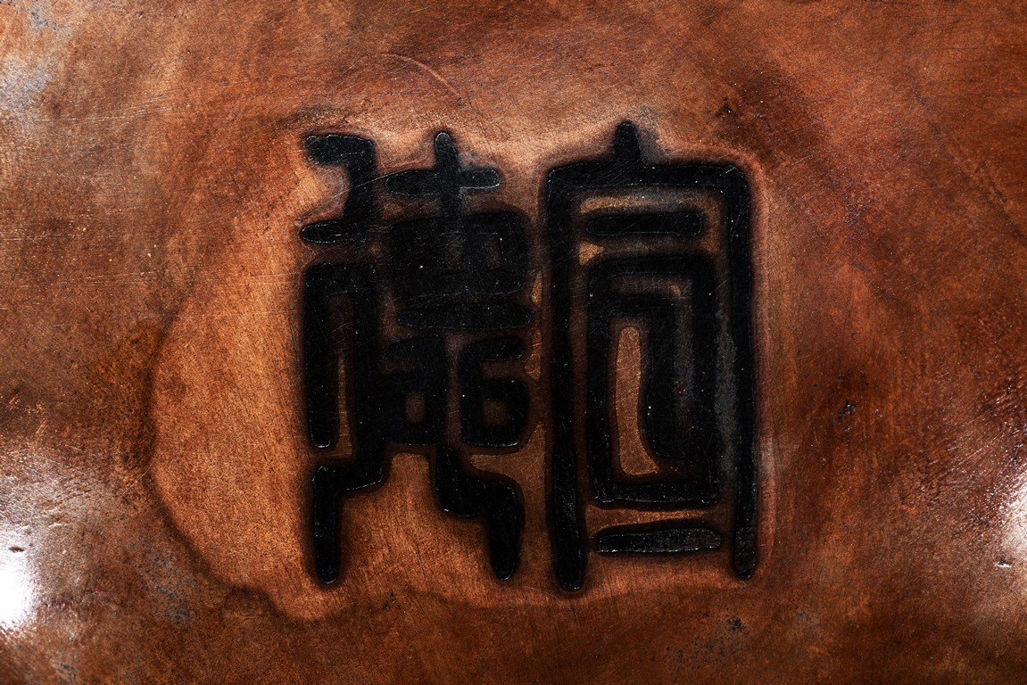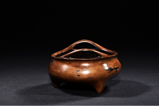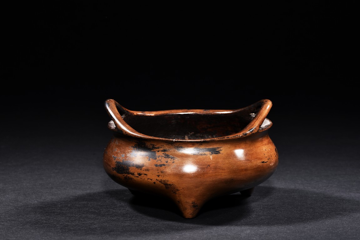 The compressed body supported on three short feet, the rim surmounted by two bail handles, the base bears two character 'Xuande' mark.