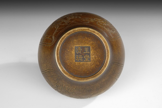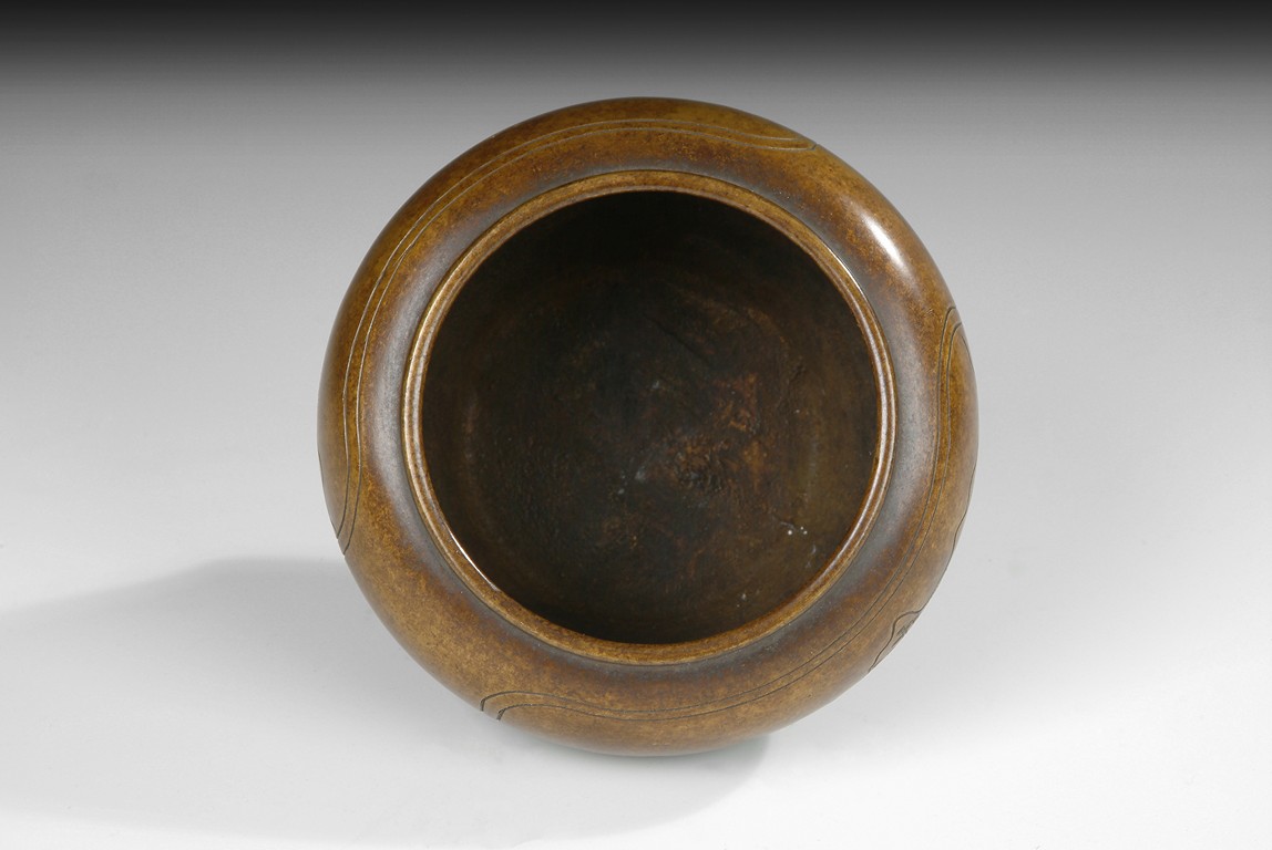 Of globular shape, the body carved with a landscape scene, including mountains, pine trees, bridge, river, pavilion, clouds, birds, and a fisherman on a boat. Bottom bears four characters 'YUTANG QINGWAN' mark.