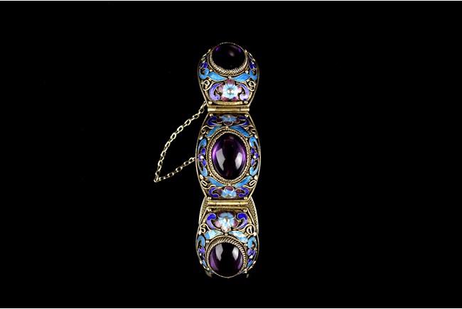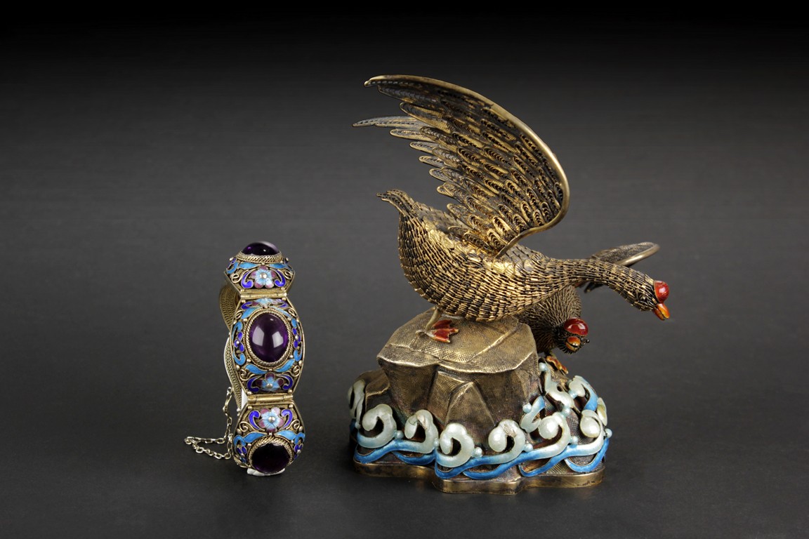 Beautifully made, the two swans standing on top of rocks within ocean waves, wings open and ready to fly. The bracelet made with six sections, four of which contain kyanite, linked with silver chain.