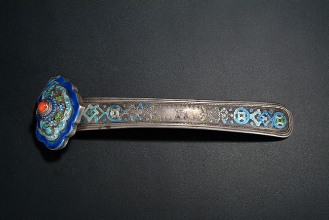 The head and handle are of separate parts, handle depicts fortune patterns, while head depicts cloud, flowers and plants, decorated with a coral. Some loss of color on the handle. Qing Dynasty period.