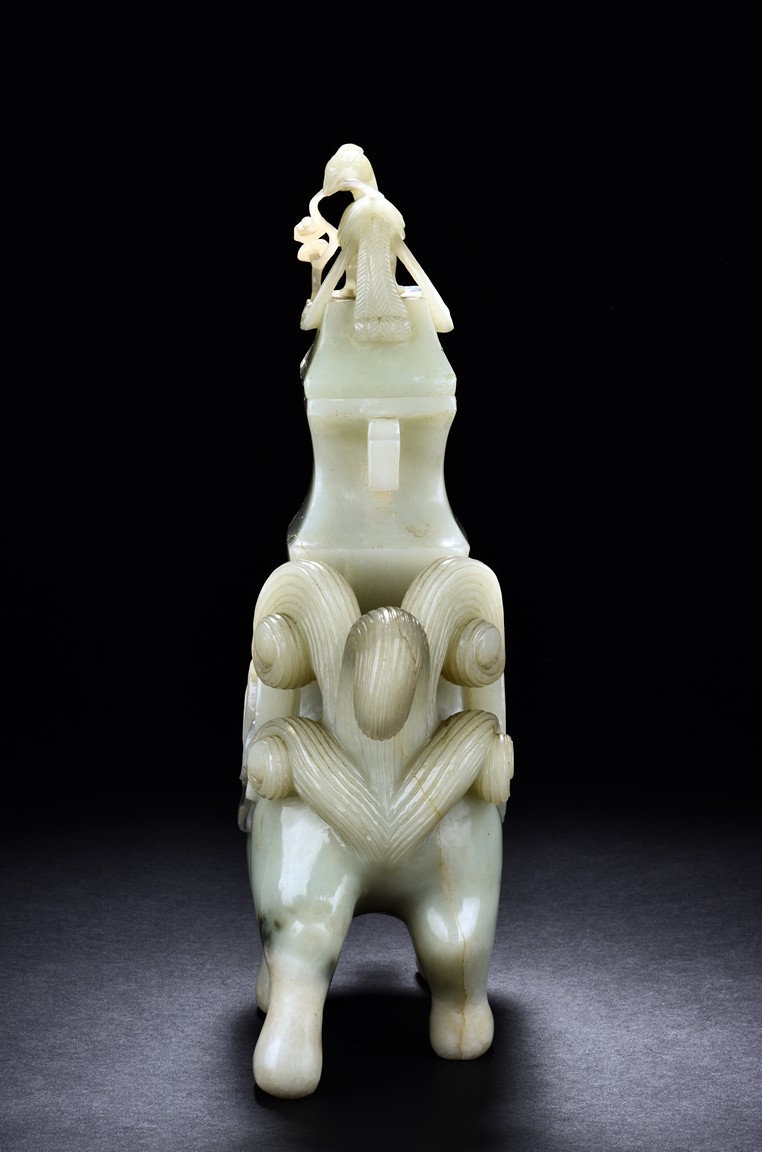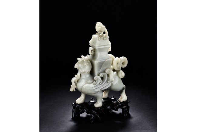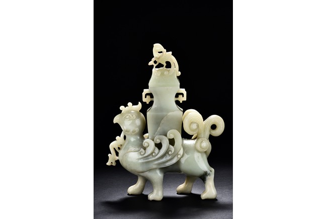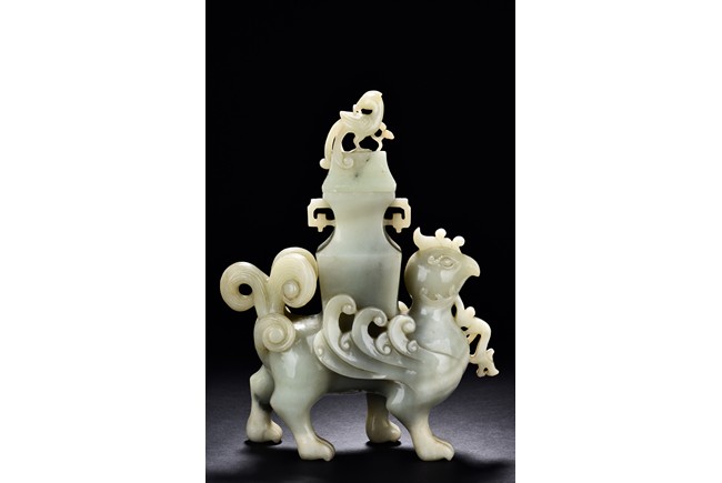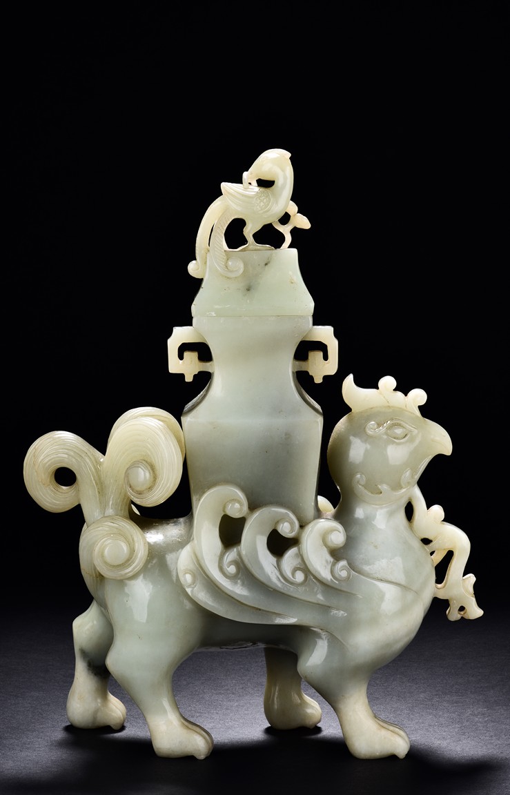 Modelled in the form of a mythical beast standing foursquare, looking straight forward, the wings curled up, the tails splitting into five curled branches , its back rests an lidded vase with recessed neck flanked by handles, the cover surmounted with a phoenix figure with long tails grasping a lingzhi branch in the mouth. Qing Dynasty period