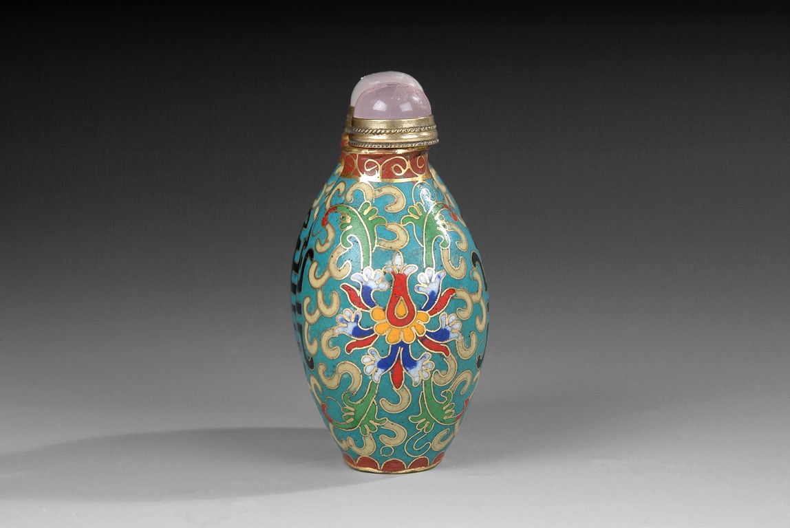 A gilt enameled cloisonne twined ovoid snuff bottle with the word 'Shou' in Chinese on the body of the bottle.