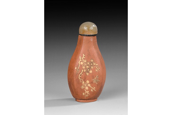 Of rounded and flattened hexagonal form, the bottle is finely painted in beige slip on the brown Zisha stoneware ground with bamboo on one side and chrysanthemum flowers on the reverse. Capped with an agate stopper, and two character 'QIANLONG' mark on the bottom.