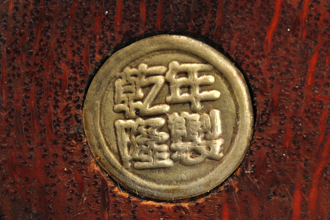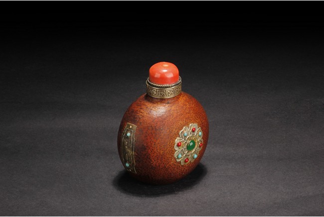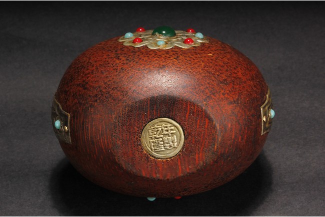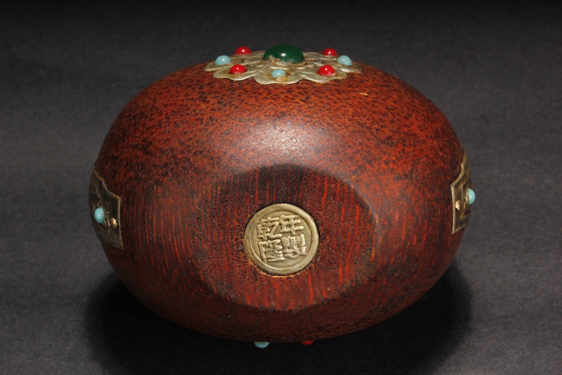 Of globular form with slightly flattened sides, the wood snuff bottle with grainy texture and dark brown color, decorated with silver, turquoise, and coral. Bottom bears four character 'QIANLONG' mark. 19th century.