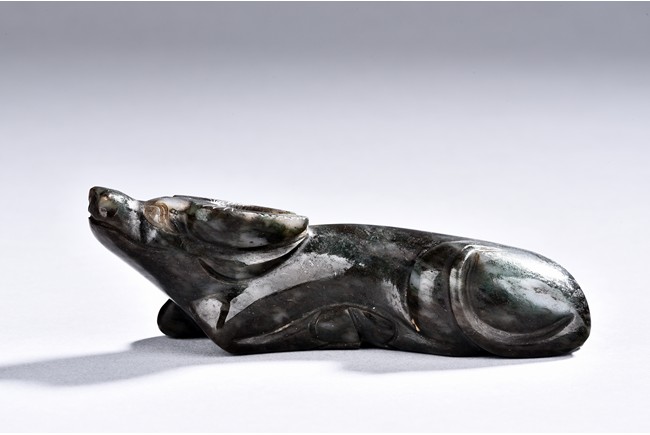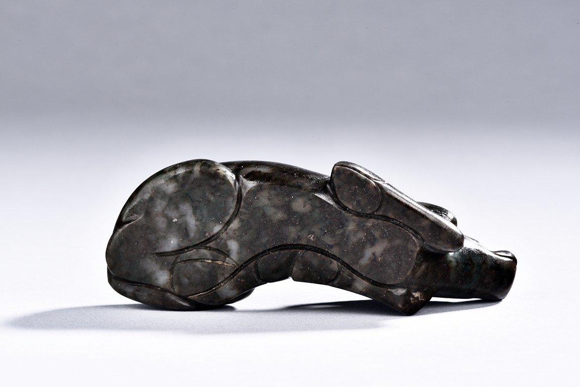 Carved as a recumbent buffalo, the stone is of mottle black and spinach green tone.