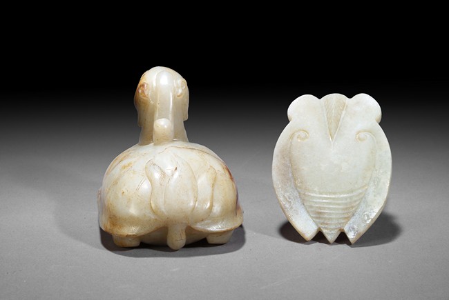 Two jade stone carvings, one of a cicada and the other of a turtle. The turtle is of celadon tone with russet inclusions and cicada is of pale celadon tone.