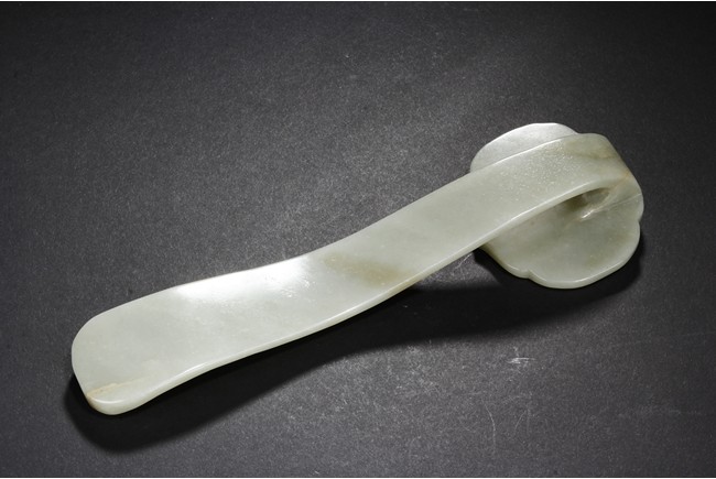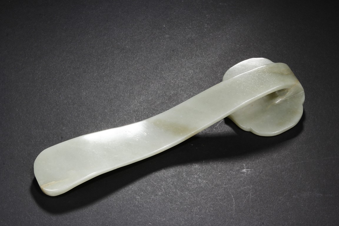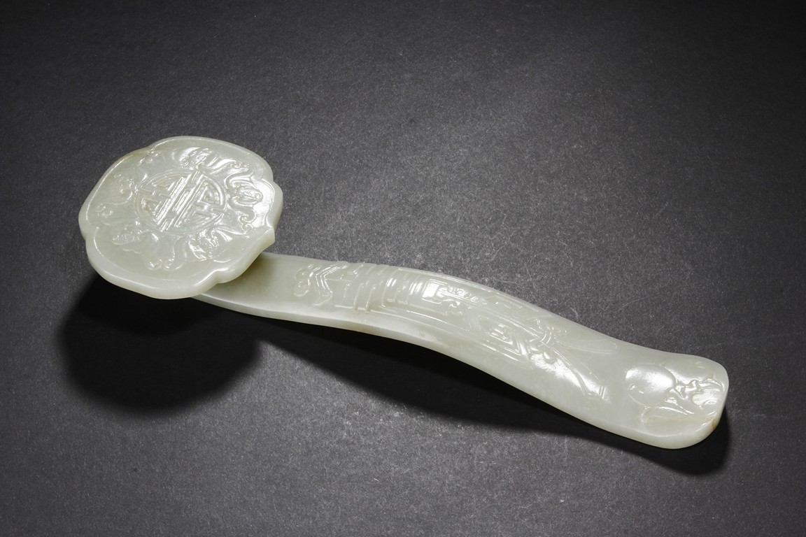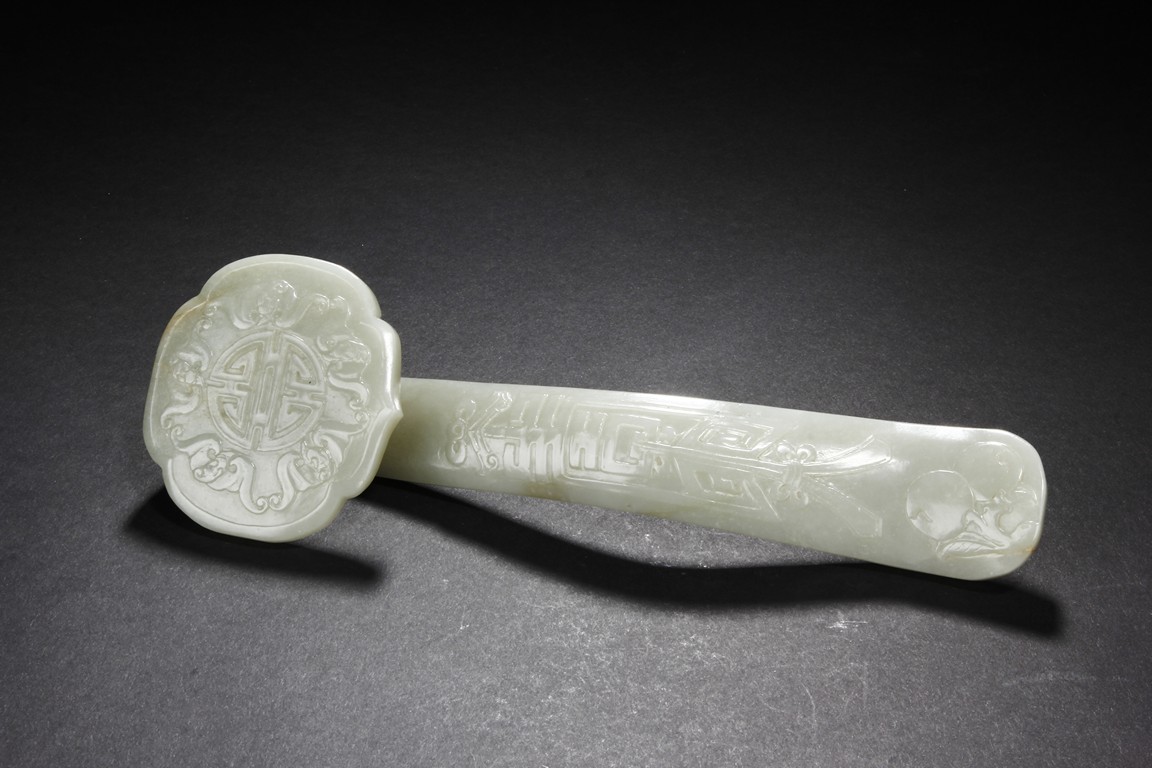 The ruyi scepter is carved in low relief with a stylized shou character surrounded by five auspicious bats in flight. The arched handle is carved with a stylized character tied with a knot resembling an emblem. The end of the handle is decorated with a leafy peach. The stone is of celadon white tone with minor russet areas. Qing Dynasty period.