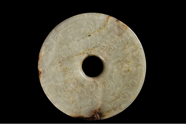 Of circular disc shape, it is carved with archaic motif. The stone is of celadonish white tone with russet inclusion. Han Dynasty period.