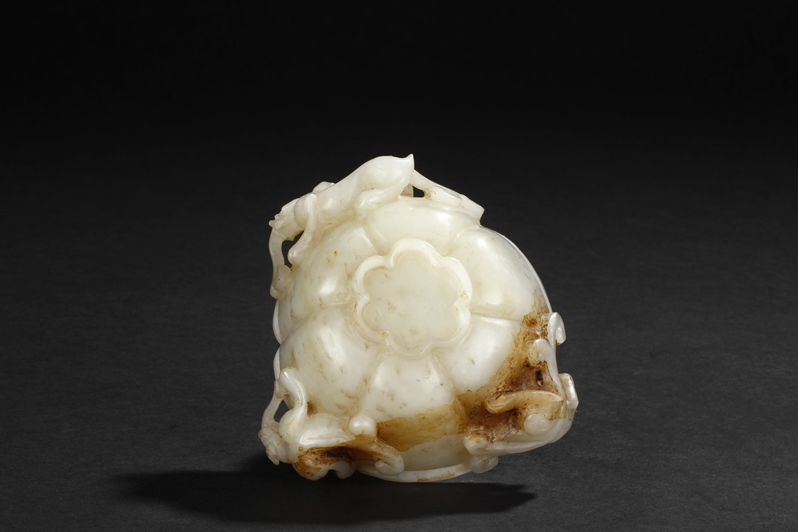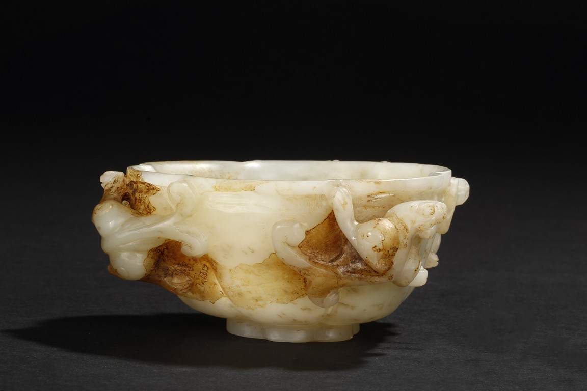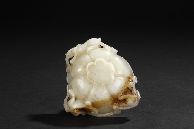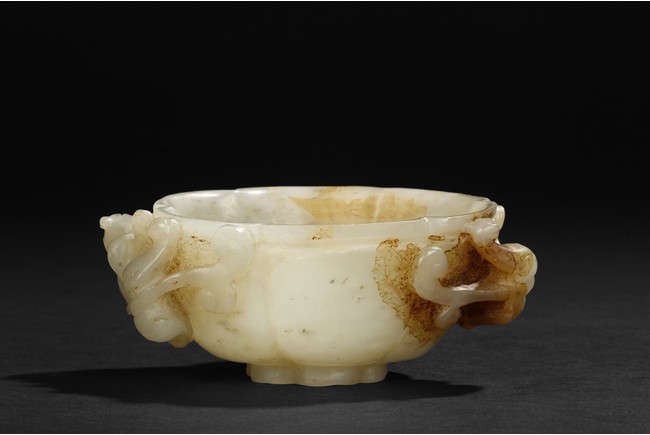 Of begonia shape and raising from a begonia shaped foot, the washer is carved in high relief with three twisted mythical beasts chilong climbing up on the sides and to the mouth rim. The stone is of white and russet tone with the latter mostly in exterior.