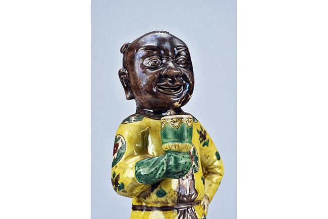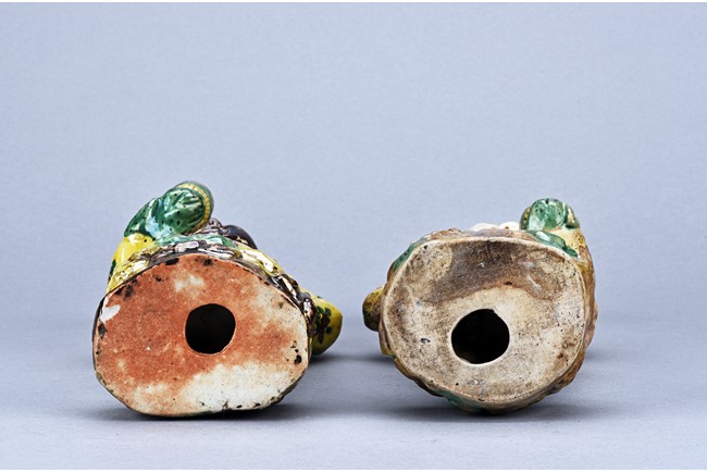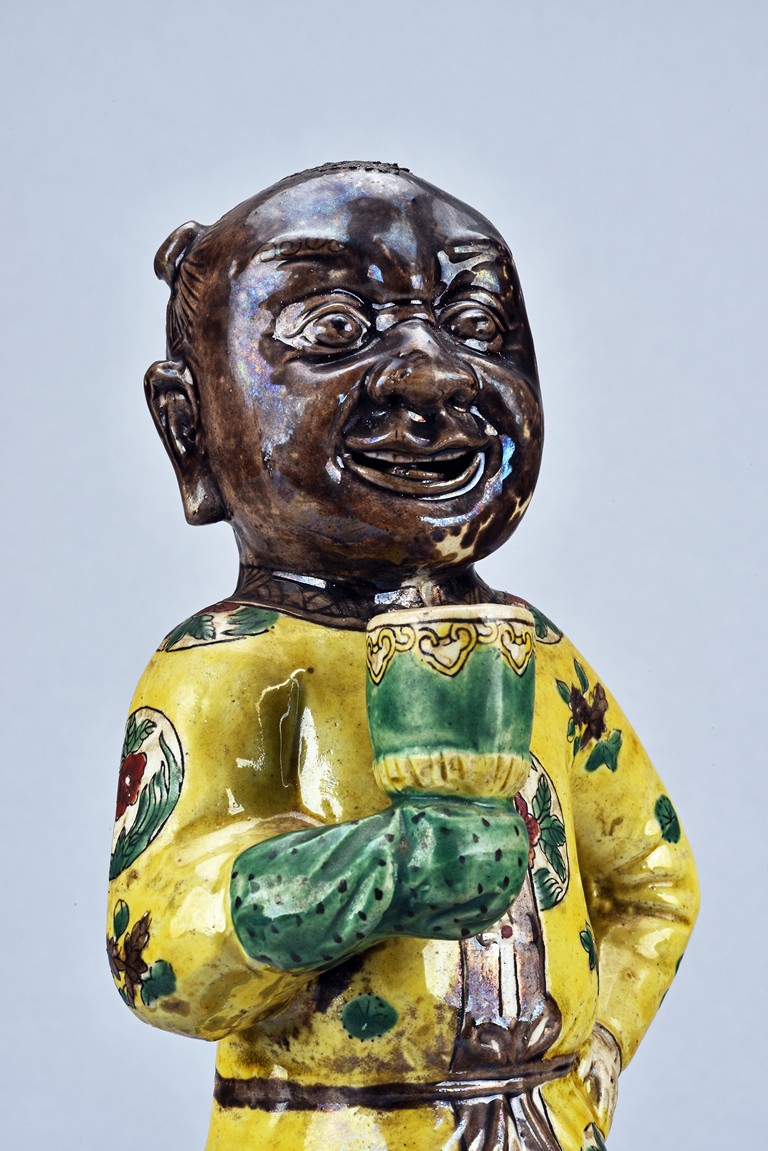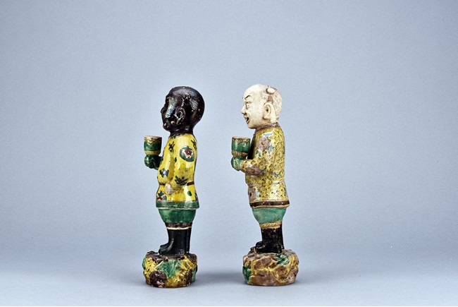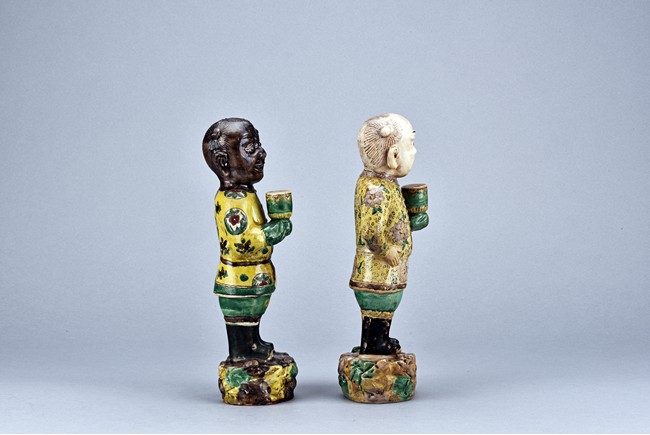 Each is modelled standing straight and holding a cup on one hand, wearing clothes enamelled in yellow and green and decorated with floral pattern, one with black, the other with white face Republic period.