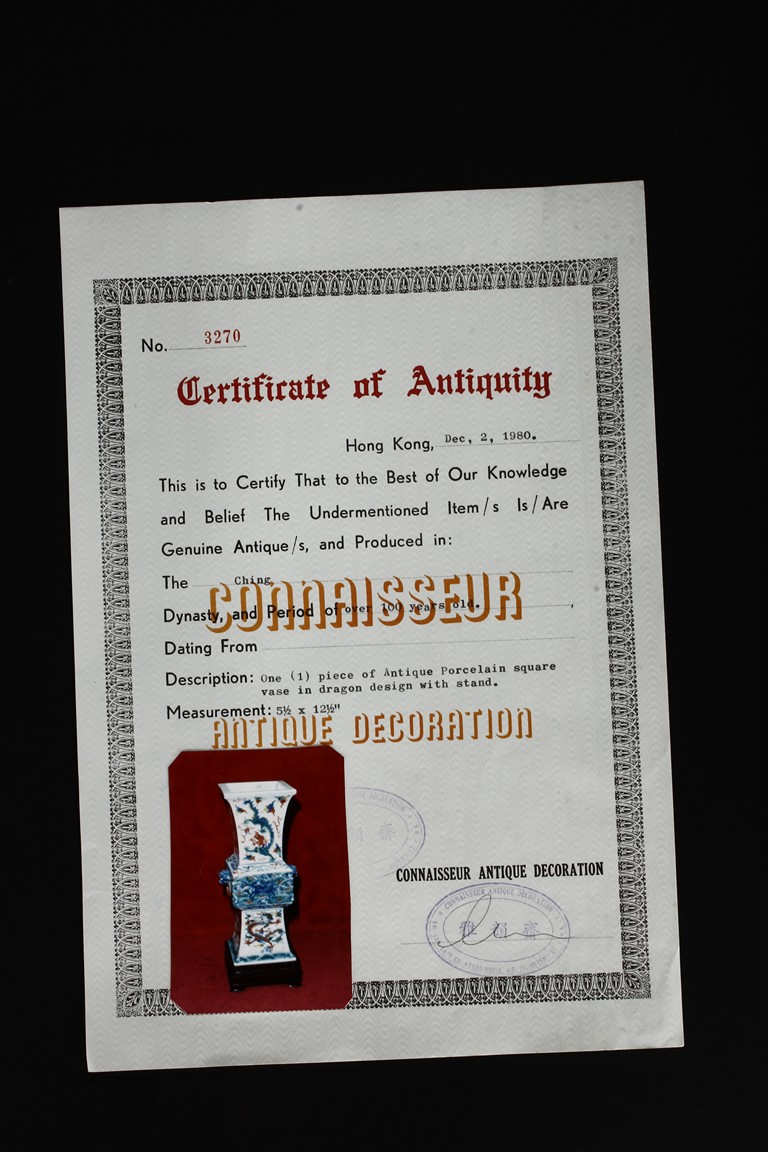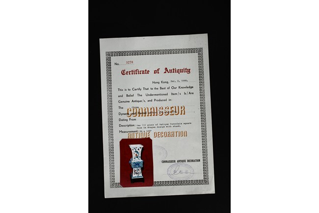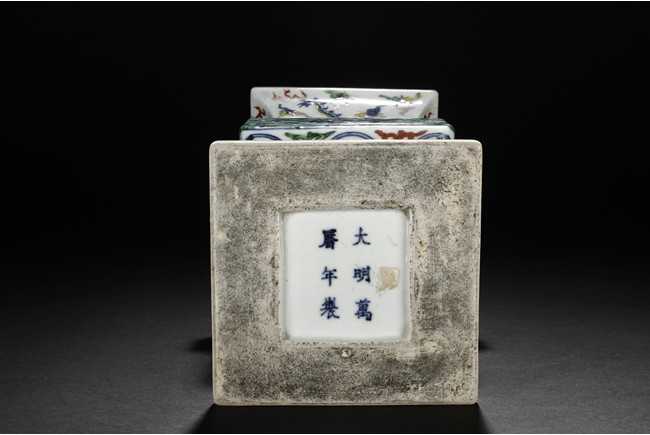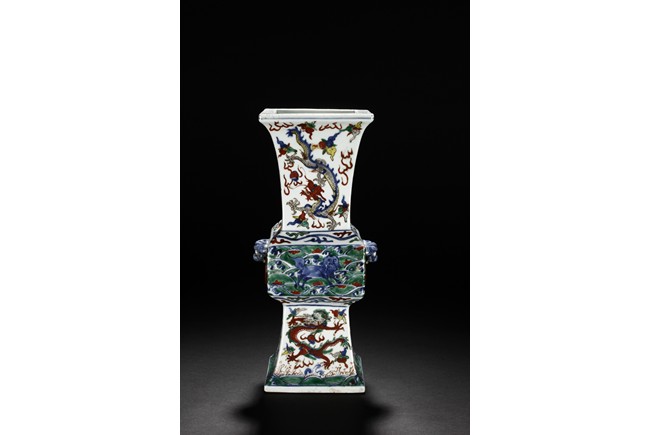 In the form of archaic Zun vessel, the mid section is finely enamelled with a mythical beast in the middle of waves, and applied on each side with a lion-mask handle suspending ring. The neck is decorated with dragons in different colors chasing the flaming pearl amidst auspicious clouds, and the lower section further enamelled with dragons above the ocean waves on each side. The unglazed bottom bears six-character 'WANLI' mark. Qing Dynasty period.