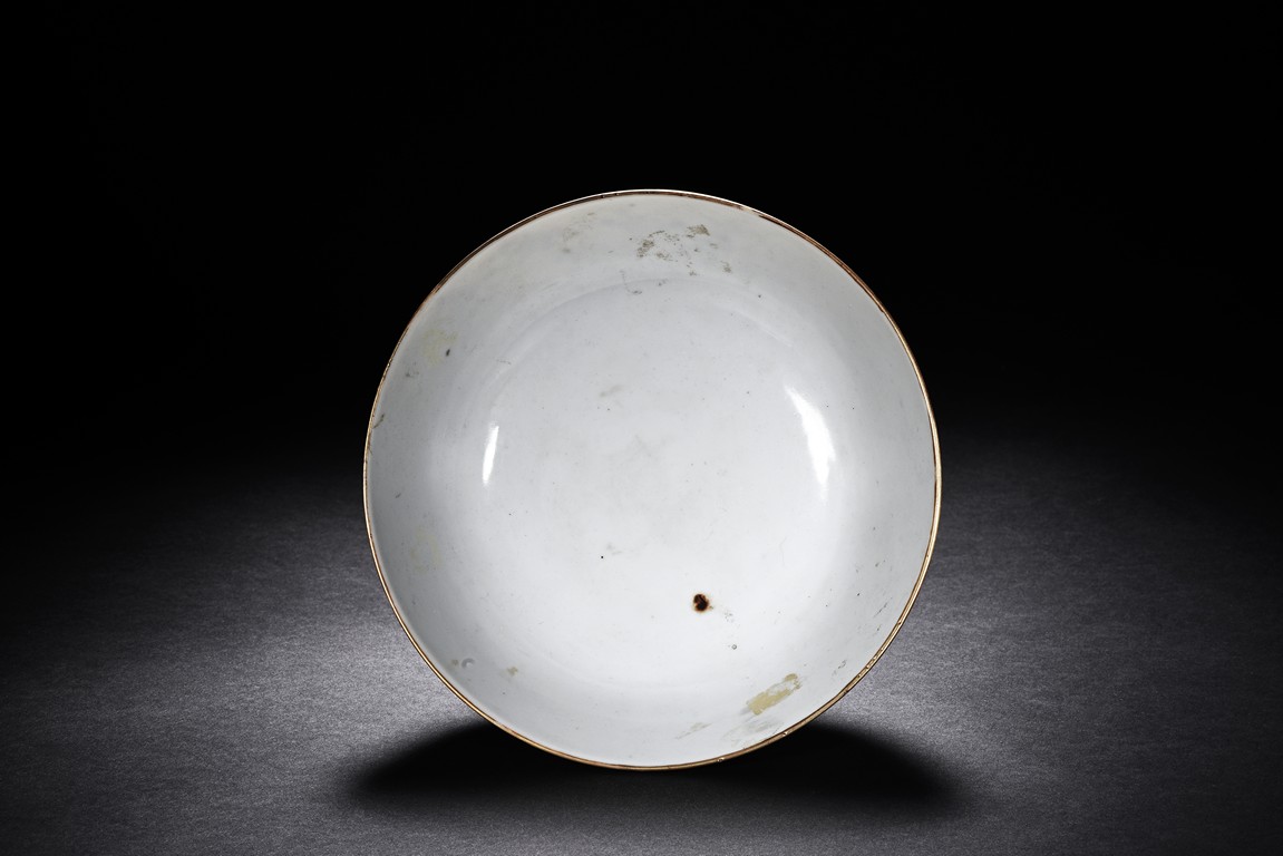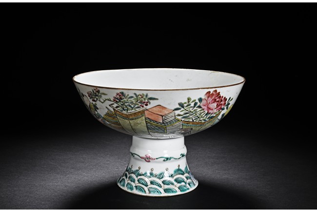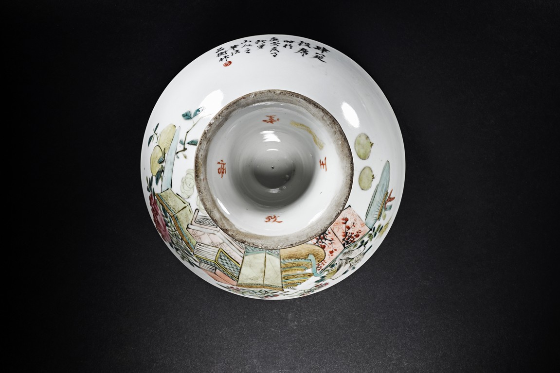 Supported on a spreading stem foot and the rounded sides of the bowl rising to rim, it is decorated in exterior with archaisitic scholar's objects and leafy flowers, the other side with poetic inscription and colophone, the stem foot painted with waves pattern. The interior of the foot painted with four characters ' Wu Tang Wang Zhi'. Late Qing Dynasty Period.