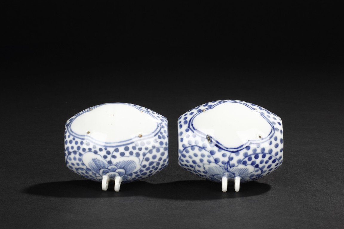 Each bird feeder is enamelled in blue and white with flowers reserved on blue dotted ground. Qing Dynasty period.