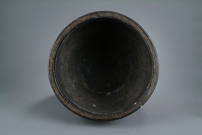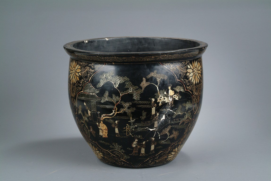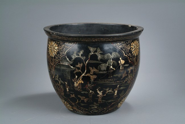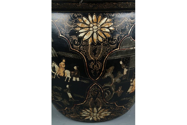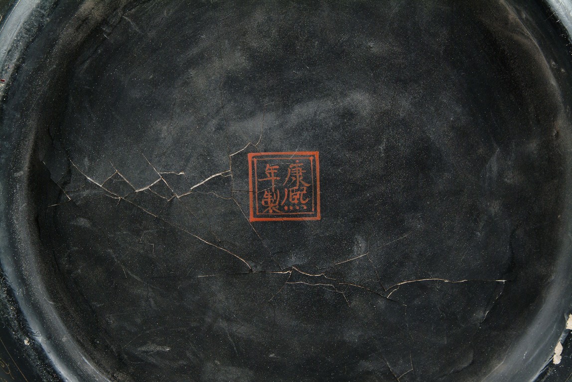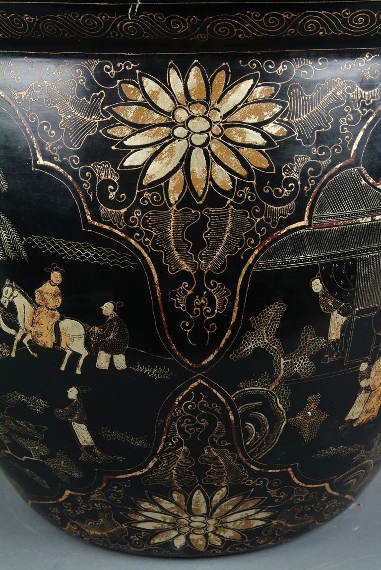 This large jardiniere of bulbous form, finely depicting a group of figural doing different activities, ruyi flowers, key-fret patterns at the rim, gilt lacquer decorated on black color ground, four Chinese character 'Kangxi nian zhi' mark on the interior bottom.