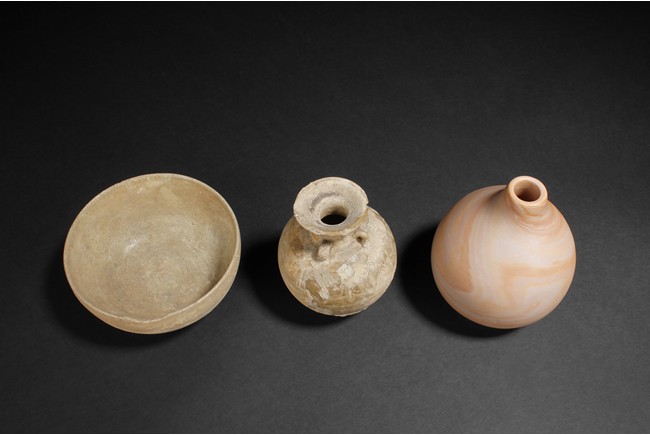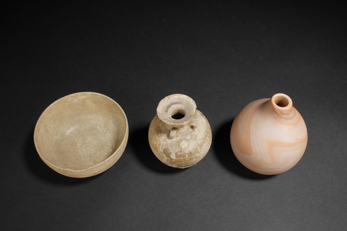 A group of nine pottery pieces, including bowls, ewer, vases, and carvings.