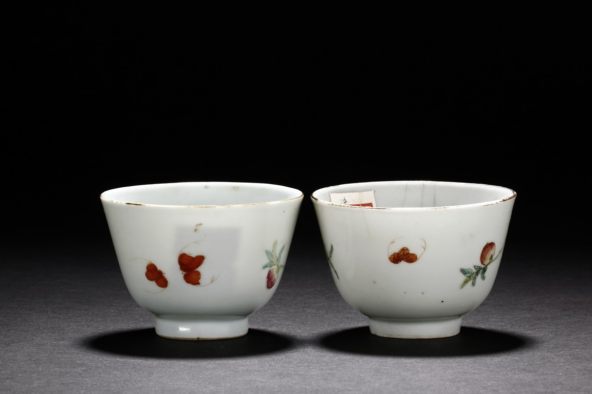 Each cup is thinly potted with steep sides rising to a flared rim, and is decorated with nine peaches growing on branches, with two flying bats on oppsite side. One bears a four character 'Shen De Tang Zhi' mark, the other bears a four character 'Hui Tong Zhen Pin' mark. Republic period.