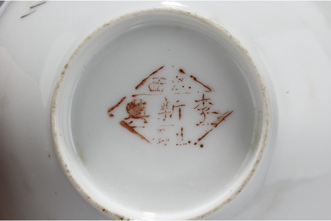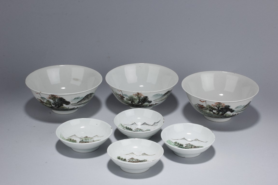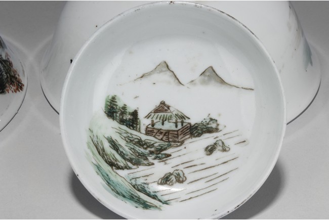 The group includes three larger bowls and four saucers. Three larger bowls with flared rims depict landscape scenery with village, boat, mountain, and river, with Chinese characters on the back.The saucer's interior depict a landscape scene with pavilion, river, and mountains. Bowls also with red marks on the bottom. Republic period.