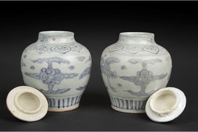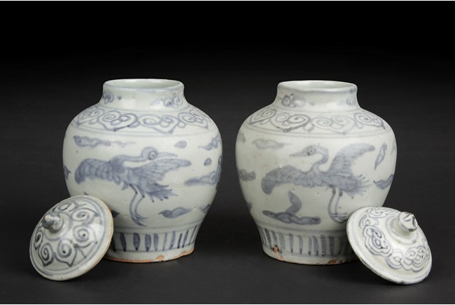Of ovoid shape, the exterior depicts flying cranes amidst clouds, below Ruyi-cloud band, the bottom left unglazed. Ming Dynasty period.