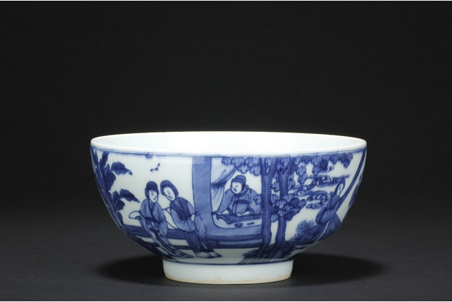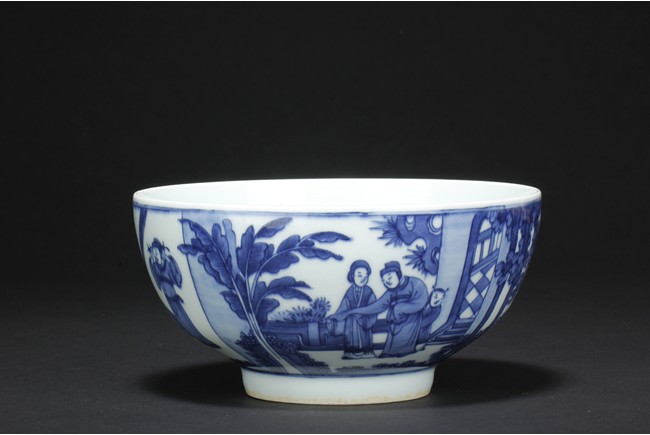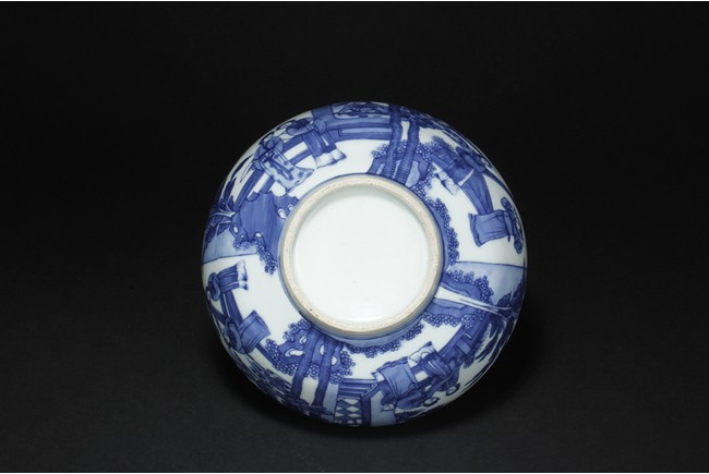 The exterior painted with scrolling scene of a well-endowed family spending time together in their large house, engaging in activities such as flower viewing, playing musical instrument, and talking with one another. Qing Dynasty period.