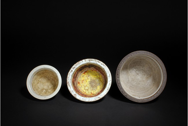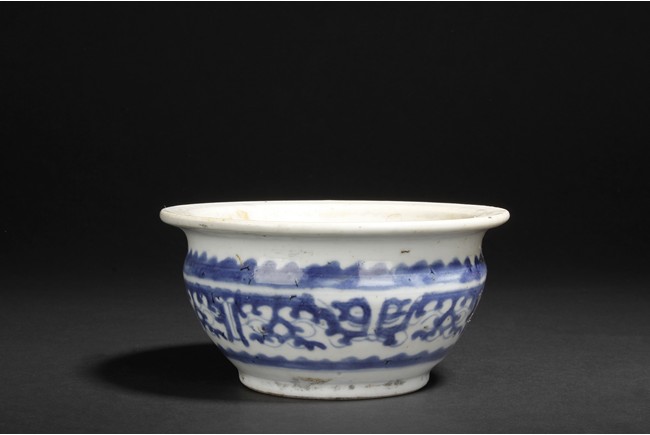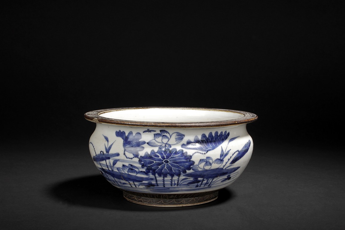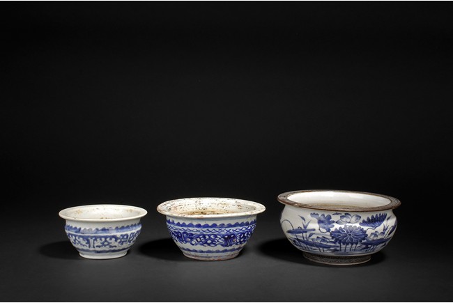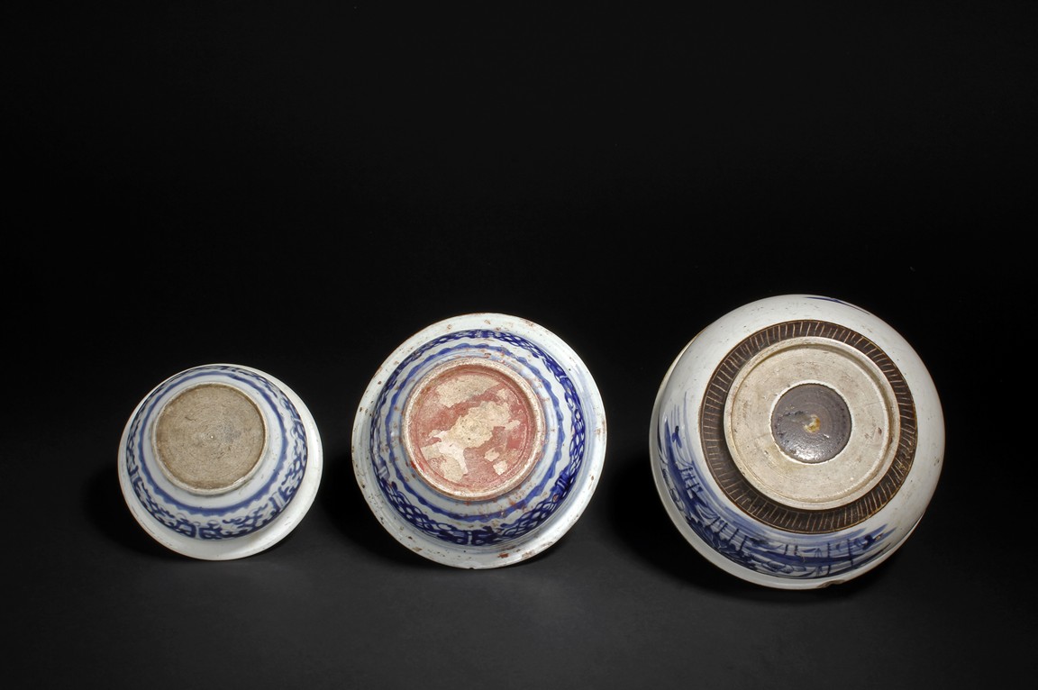 Three blue and white bowls, each with different theme, including lotus flowers, ocean waves, and vines.