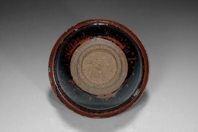 Of flared form on a short foot, the sides of the bowl rise to rim with russet fur markings on body. The foot is unglazed.
