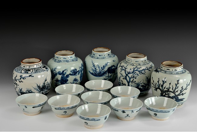 A SET OF PROVINCIAL KILN UNDERGLAZED BLUE AND WHITE BOWLS AND FLASKS 明/清 民窯青花碗,罐一組
