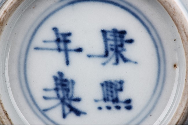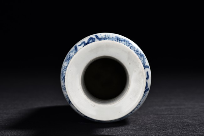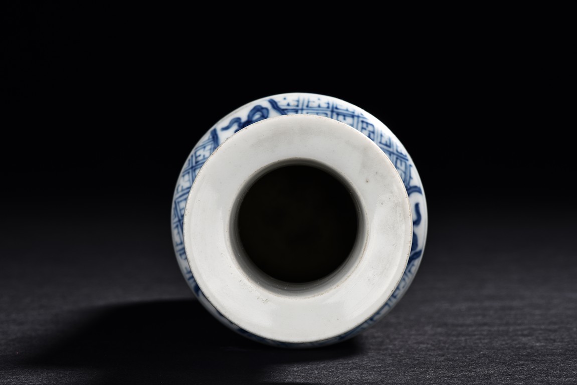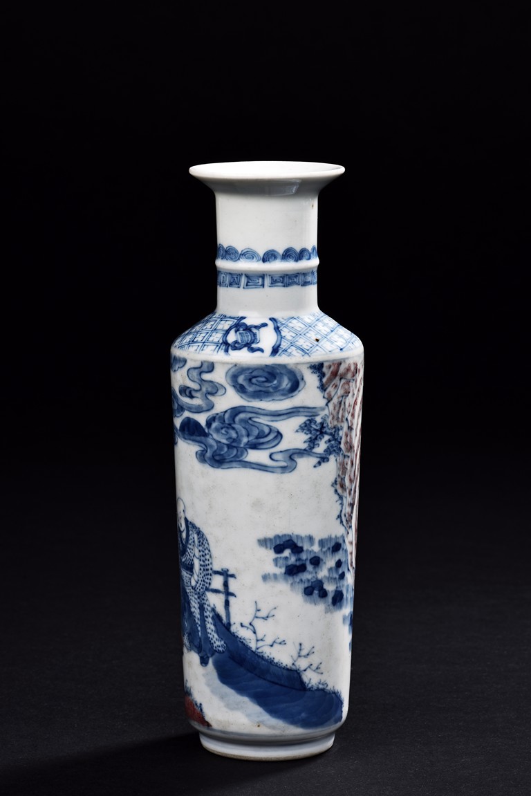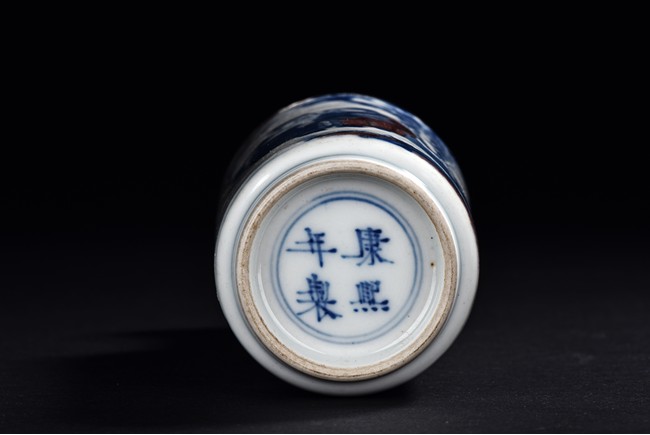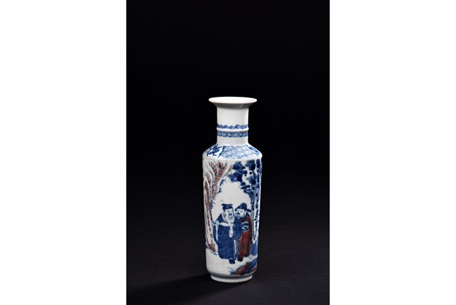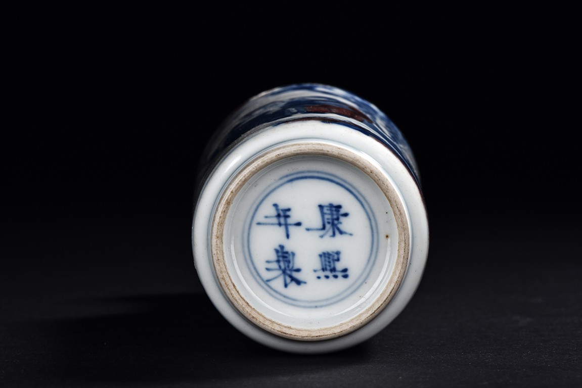 Of cylindrical shape, the body is finely painted in cobalt blue and copper red to depict two scholars conversing and two monks within a garden scene under auspicious clouds. The neck is decorated with key-fret band and rollng cloud band. The bottom bears a four character 'Kangxi' mark.