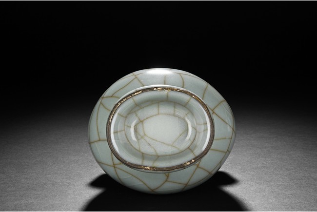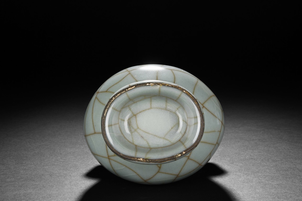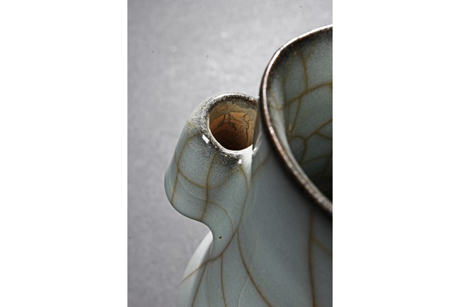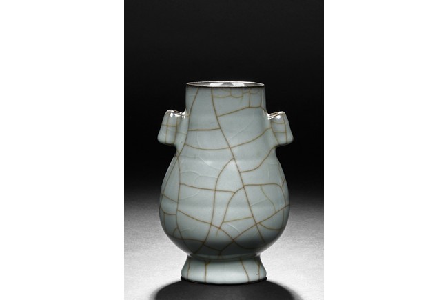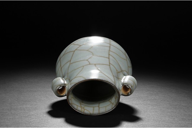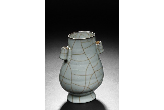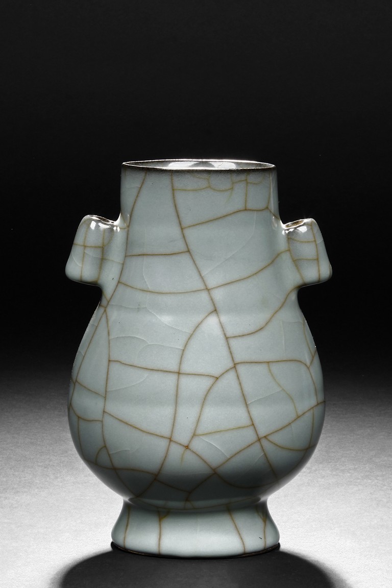 Of bulbous form, the body supported by splayed cylindrical foot, two lug handles on the wide neck, the body glazed in celadon, with crackle patterns. Qing Dynasty period