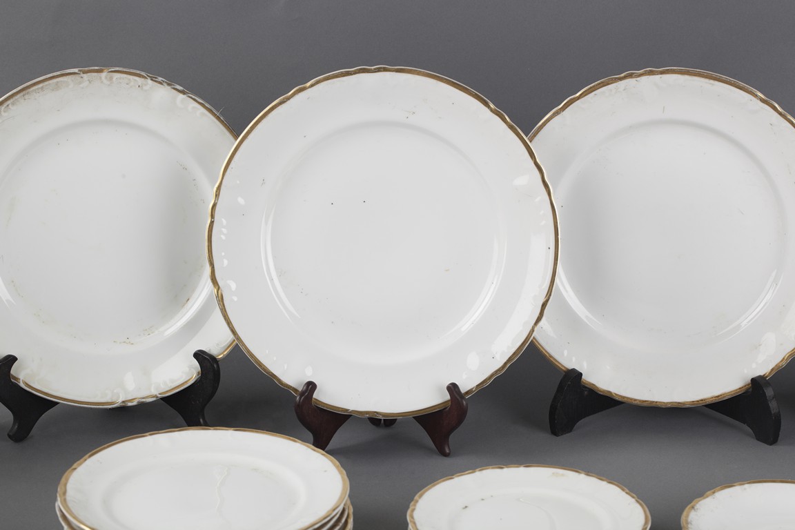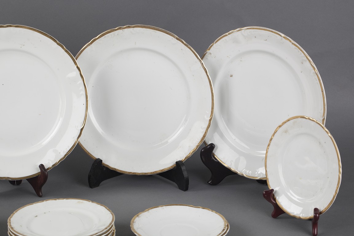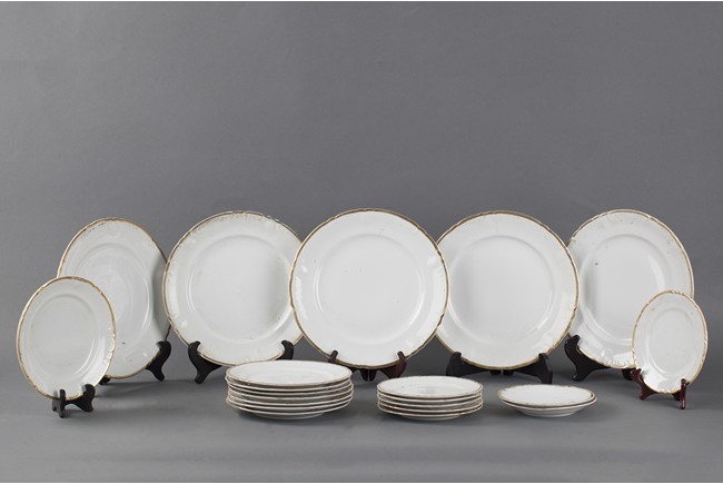 This set of dishes includes twenty one white dishes of identical design but different sizes. The edges of all the dishes are covered in gold, with floral edges.