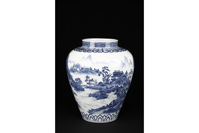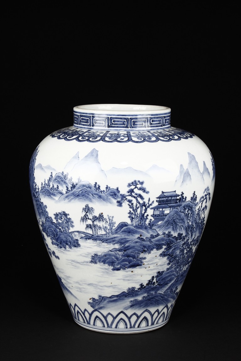 Tapering from the gently curved shoulders, the jar's body depicts a mountain, river, and village landscape scene, between band of lotus petal patterns and band of sectioned flower patterns, and the neck with key-fret patterns. Qing Dynasty Period.
