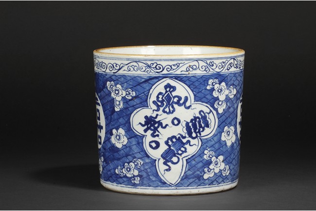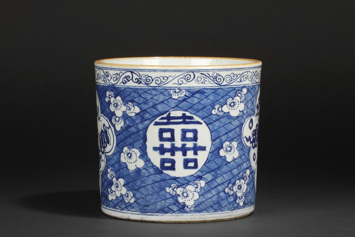 The blue and white brush finely depicts a double happiness in Chinese characters on the body of the pot along with flower blossom and kites flying within a large motif of a flower petal.