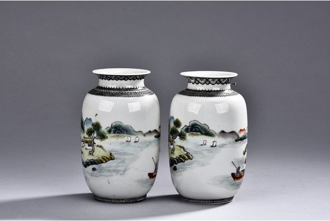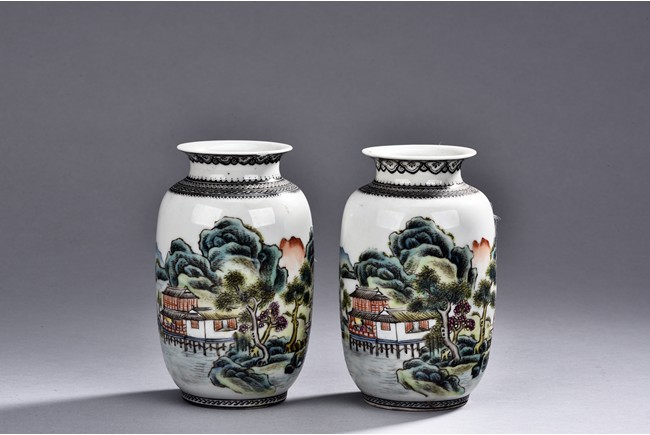 A PAIR OF FAMILLE ROSE JARS 山水瓶 一對