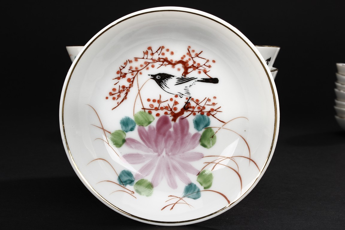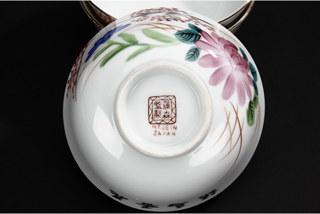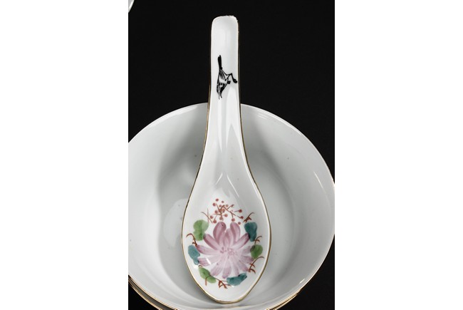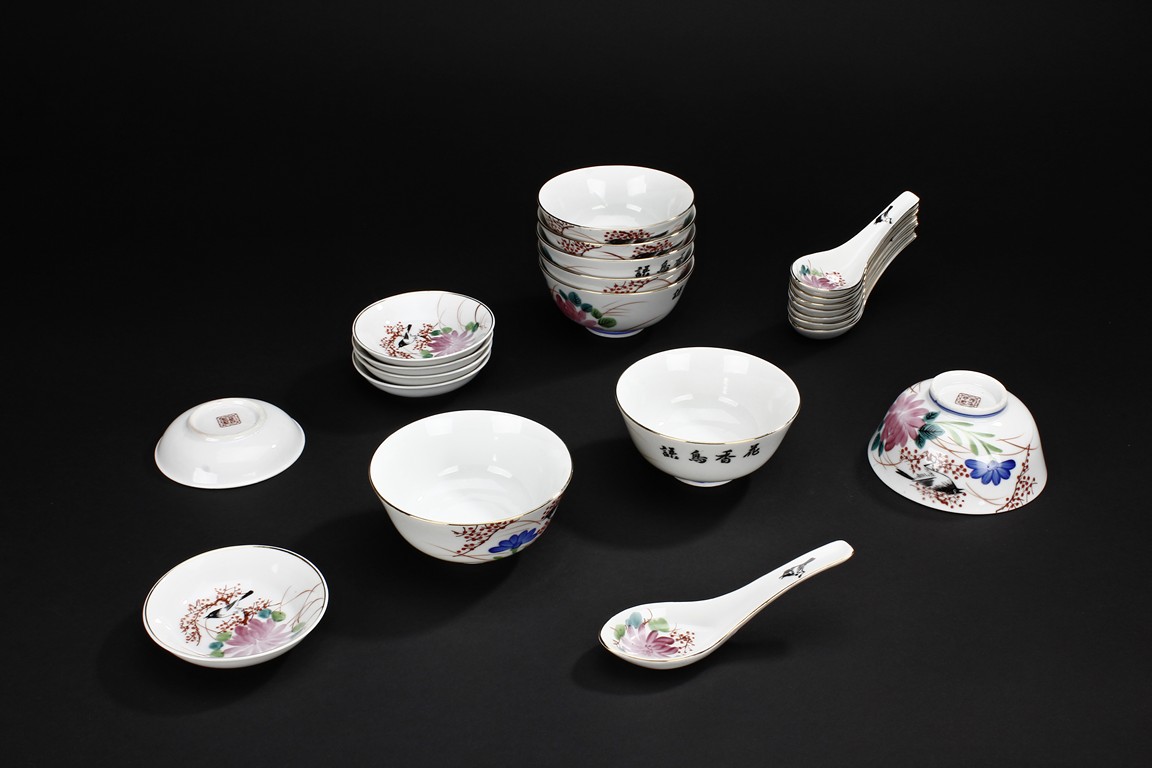 "The set of famille rose dinnerware includes eight bowls, six saucers, and eight spoons, the exterior themed birds and flowers, the bottom with four character seal mark, and ""MADE IN JAPAN"". Republic period."