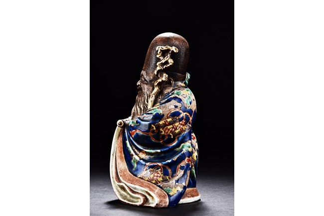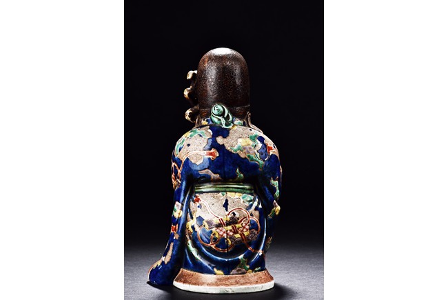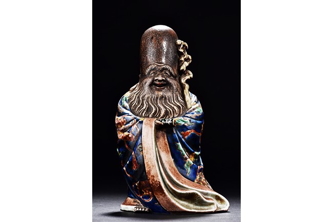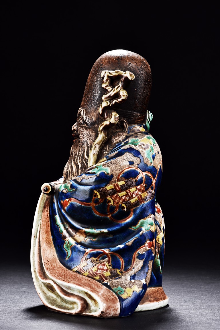 The immortal is modelled wearing a long and loose robe, enamelled with scroll motif and auspicious clouds in blue, green, yellow and red glaze. With a high and domed forehead, his face is shown with a joyful and benevolent expression, the beard detailed with incised lines. Qing Dynasty period.