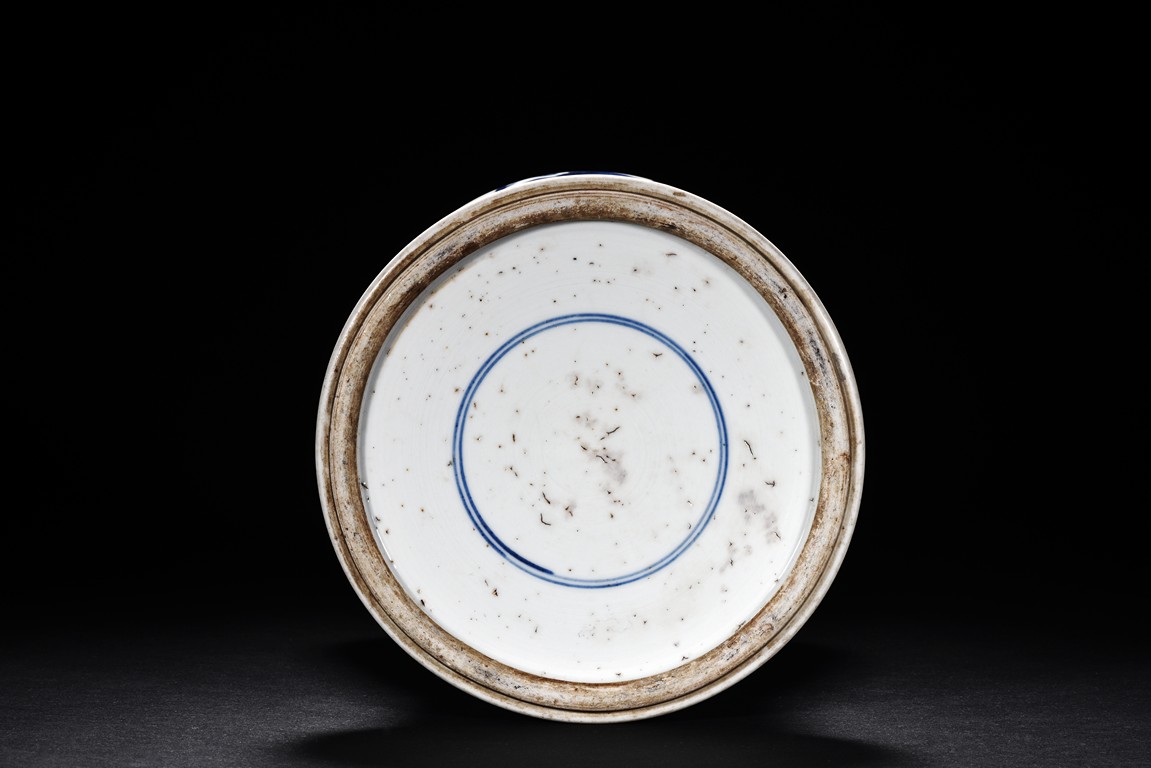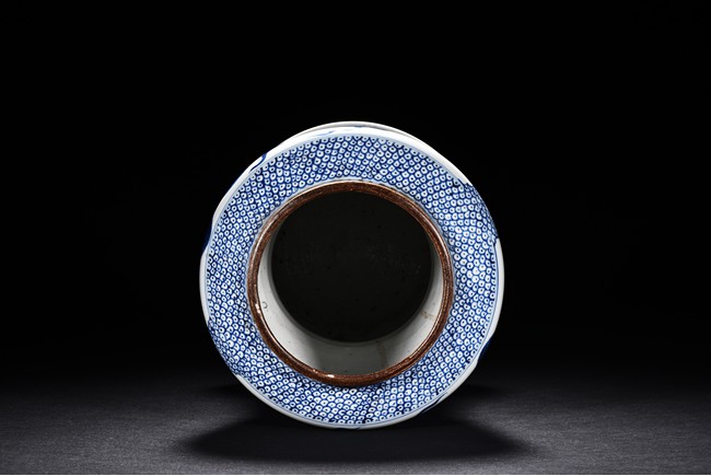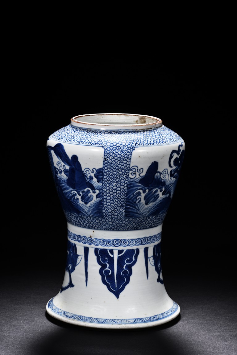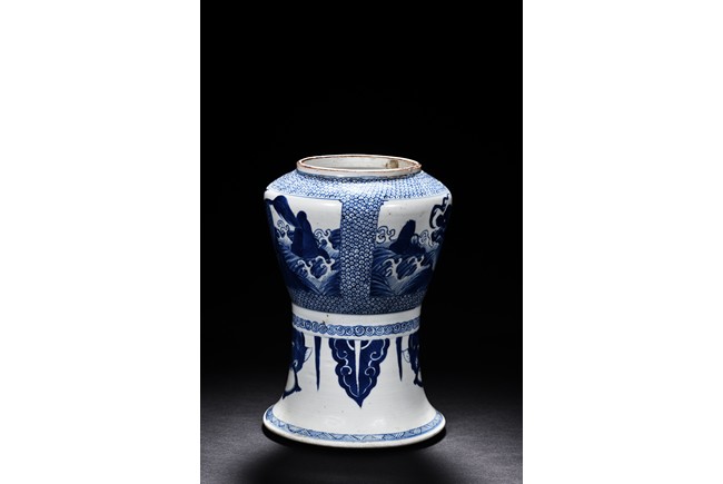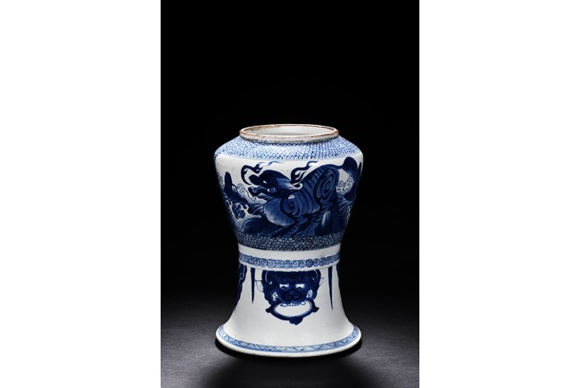 Of archaistic zun form, the exterior is painted with mythical beast amid waves and mountains, with a mythical beast handle decoration below.