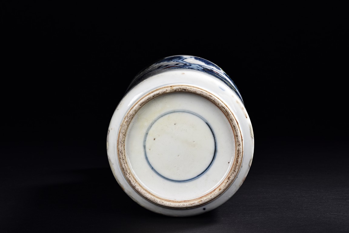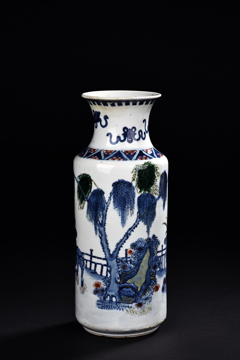 The vase is painted with a three figures in a garden scene,with willows and auspicious clouds. The neck is decorated with buddhist emblems. Qing Dynasty period.
