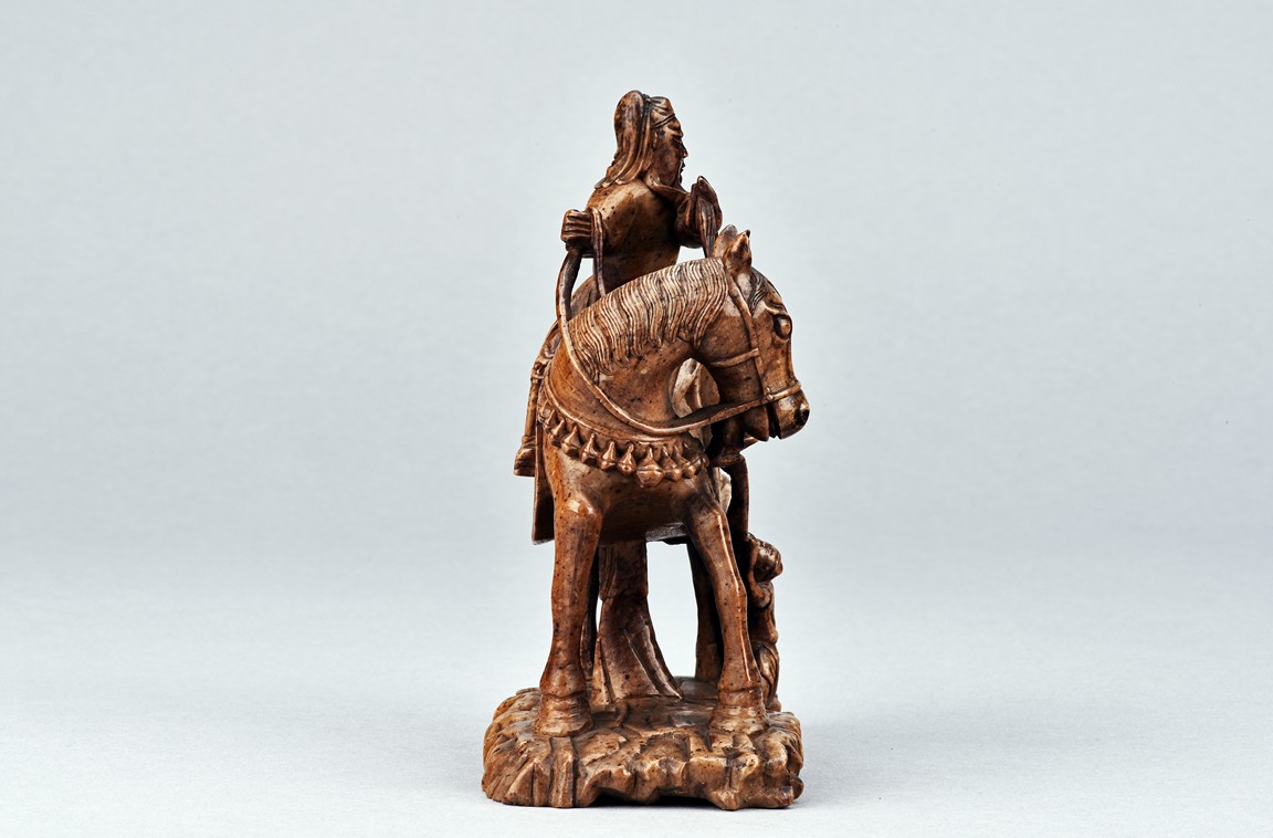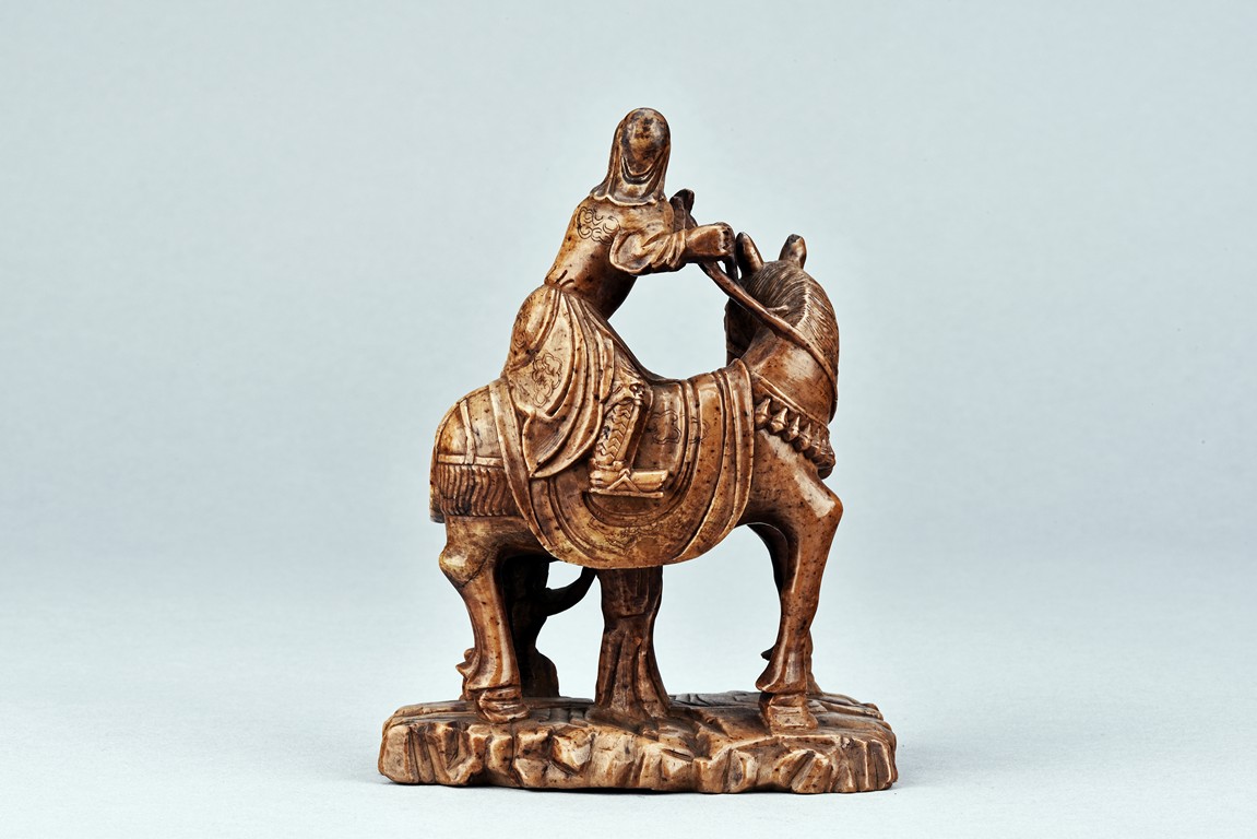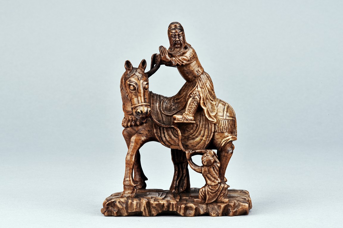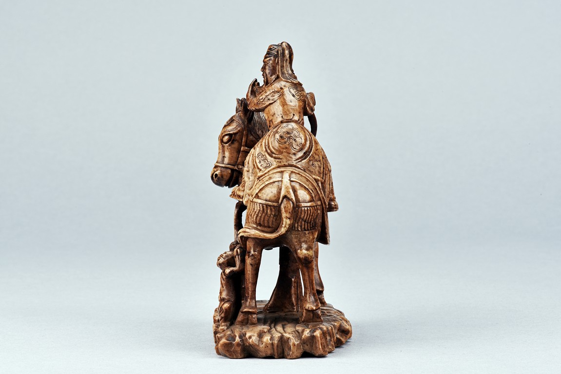 A SHOUSHAN STONE CARVED GUANGONG ON HORSE 壽山石雕關公騎馬
