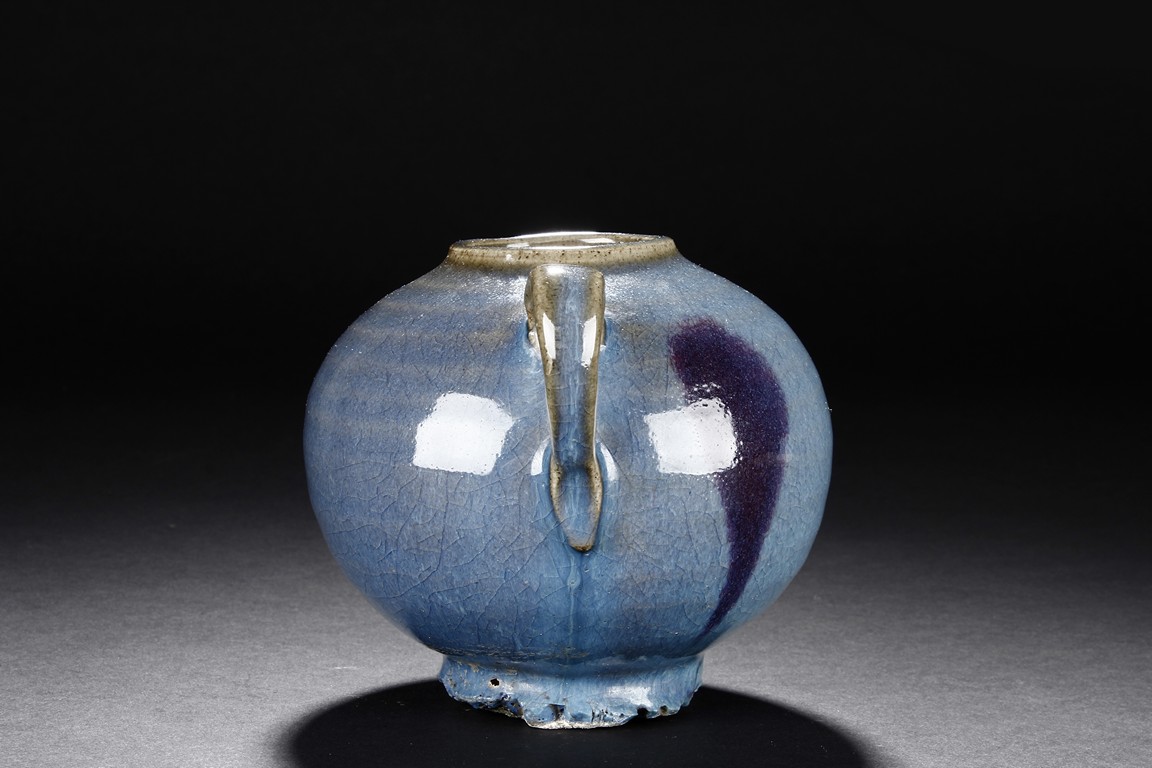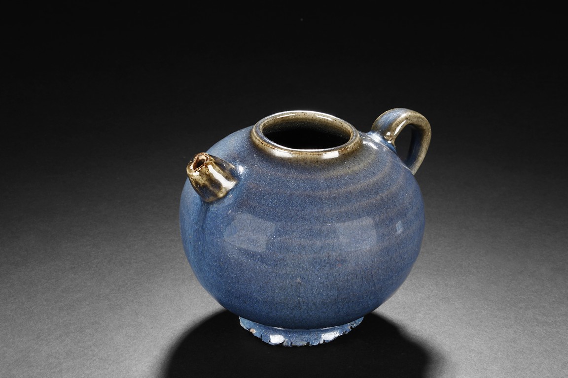 Of bulbous form, the Jun-type teapot glazed in attractive blueish purple, with layered brown rings and crackle patterns. The bottom unglazed and has chipping damage. Ming Dynasty period.