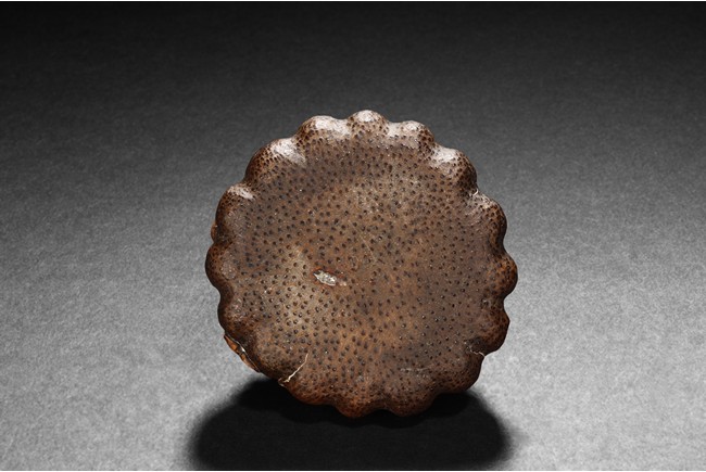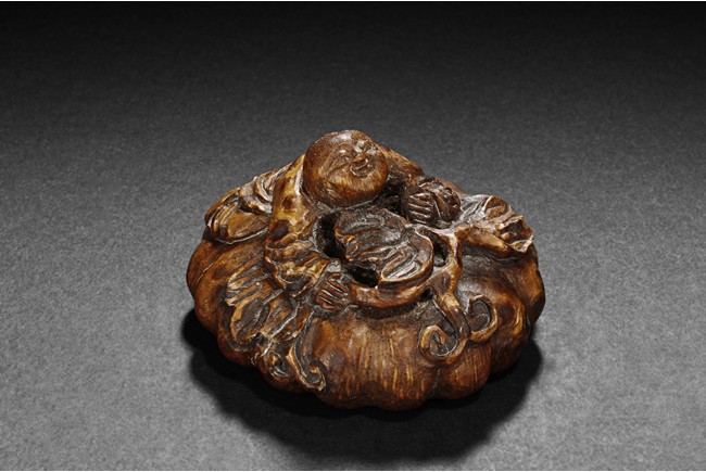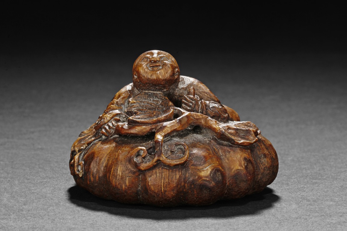 Of compressed globular form, the root carving depicts Liu Hai climbing and laying on top of a mound, looking upwards, with vines and leaves around him. Natural color and grain on the carving.