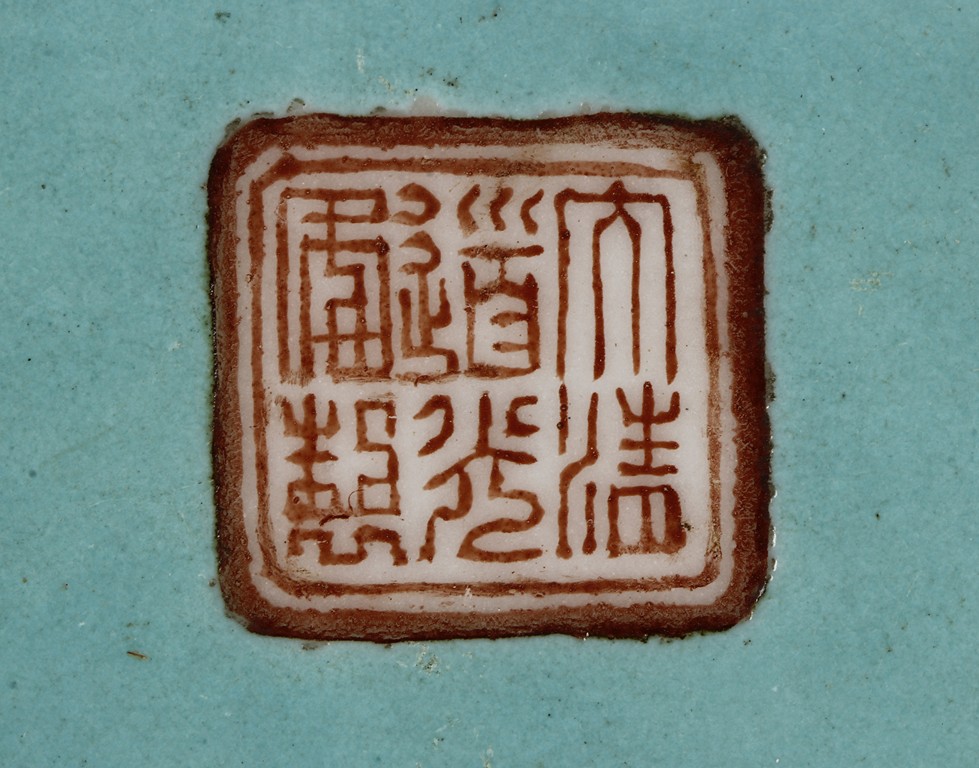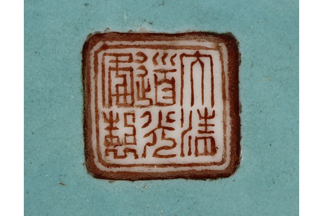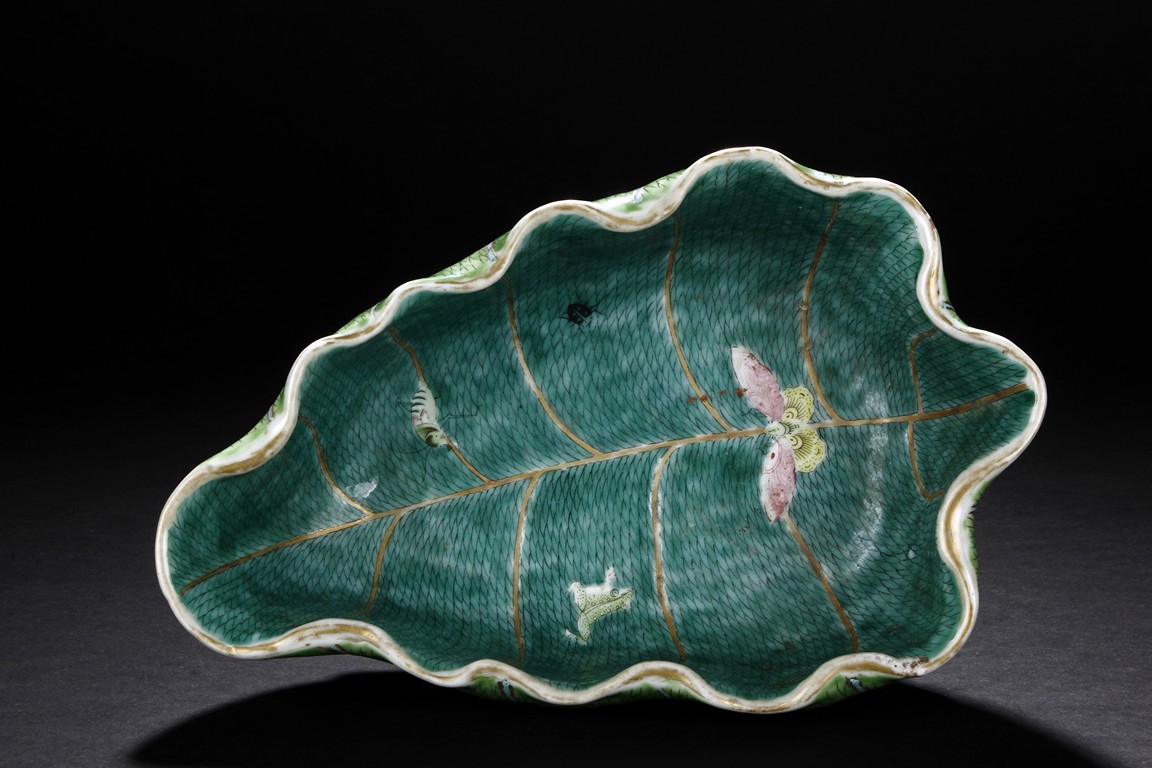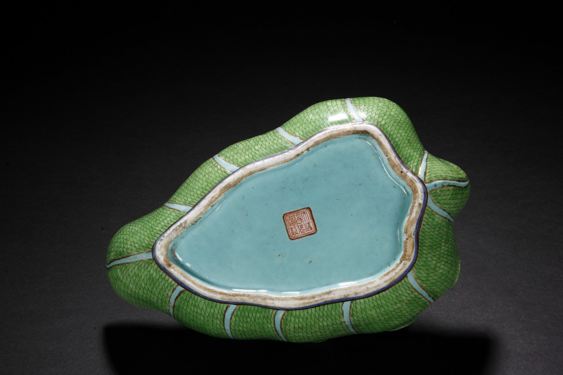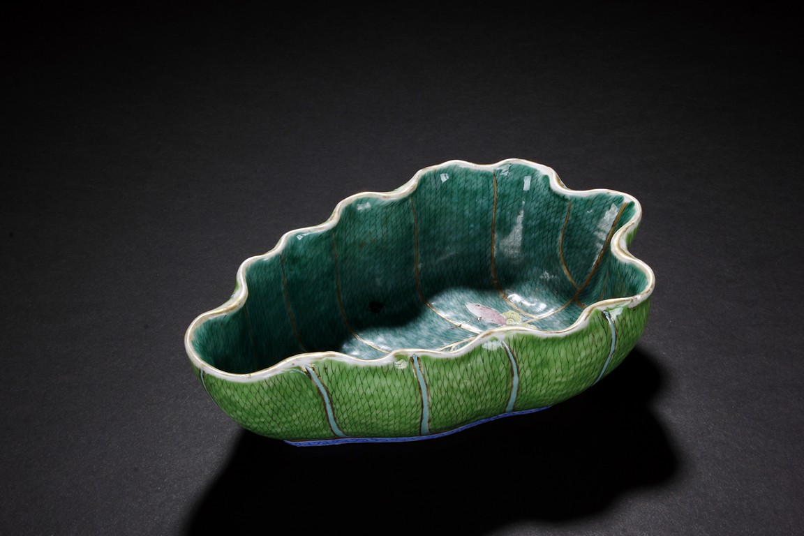 Of lotus leaf shape, the washer is enamelled with green glaze both exterior and interior. The interior bears a butterfly, a frog, and a grasshopper. The bottom bears a six character 'Daoguang' mark reserved on turquois ground.