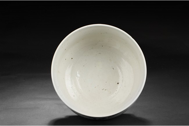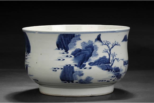 Of elegant curved bulbous body, supported by a straight ring foot, exterior depicting a mountain and river landscape scene, with pavilions, houses, boats, pine trees, and people in the scene. Qing Dynasty period.