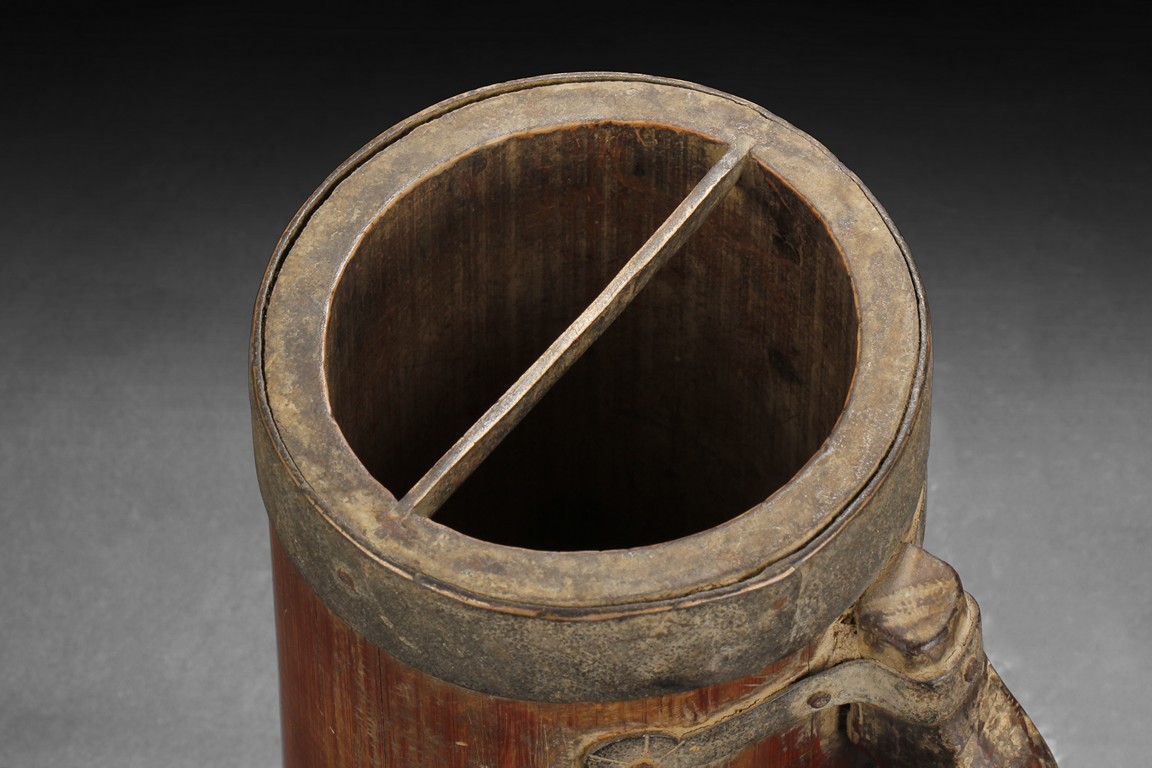 Of cylindrical form, the mug's top, bottom,and handle were encased by bronze frame, with a divider on top, similar to rice bucket. Qing Dynasty period.