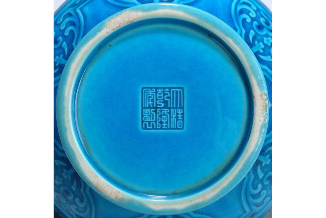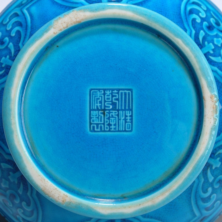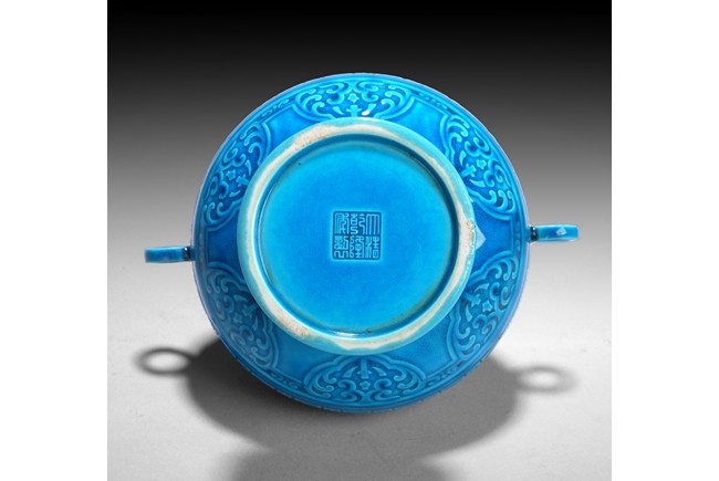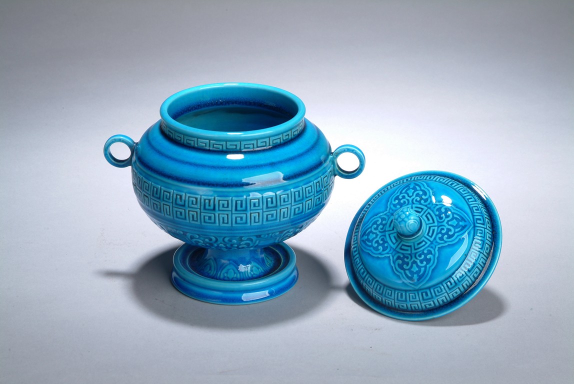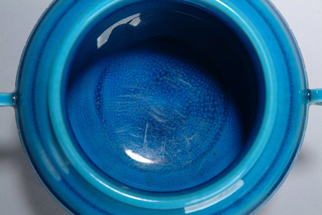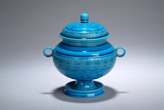 CHINESE BLUE GLAZED JAR AND COVER 藍釉有蓋高腳罐 (有款)
