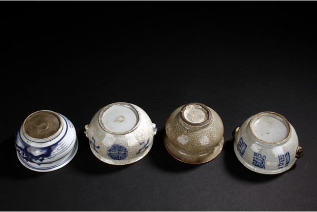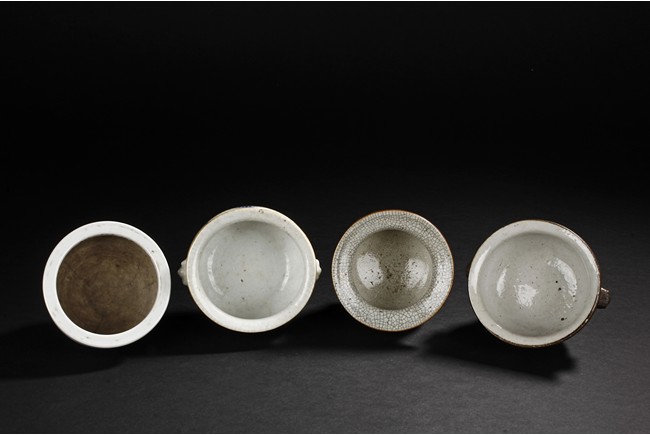 The set includes four ceramic censors, one with stylized 'fu' characters, one with landscape, one with crackled pattern, and one shou character.