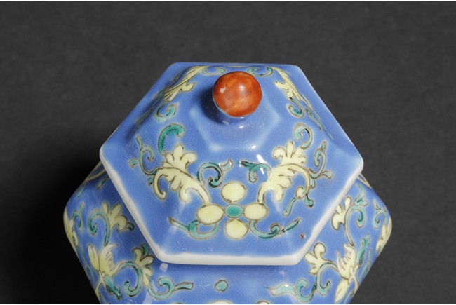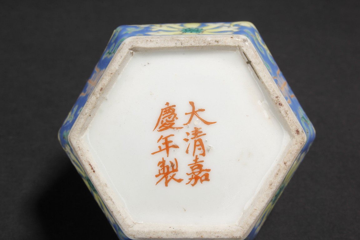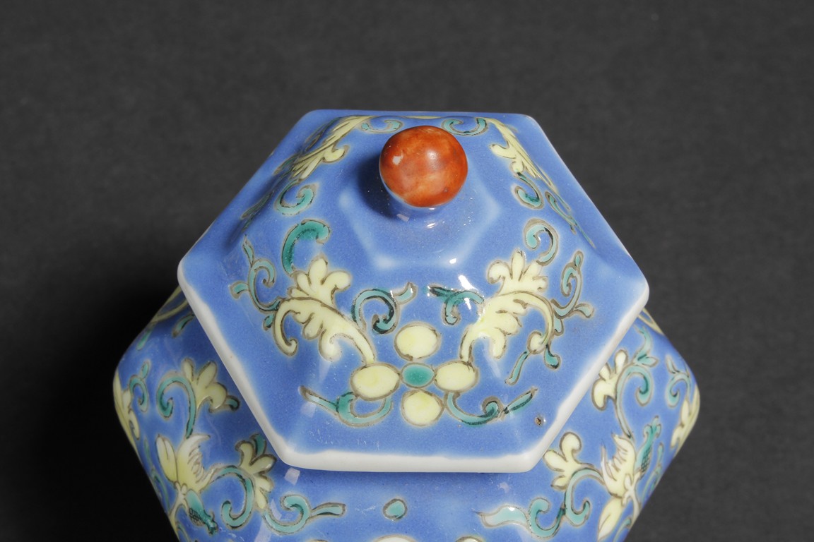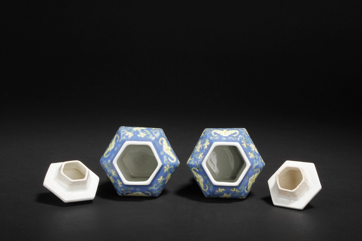 A pair of hexagonal jars with covers, glazed in light blue, the word 'Shou' in Chinese depicted on the body of the jar along with ruyi flowers and vines, cover is also in the hexagonal shape with a small knot in red color on the top of the cover. 'Jiaqing' mark on the bottom.