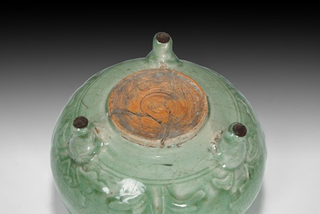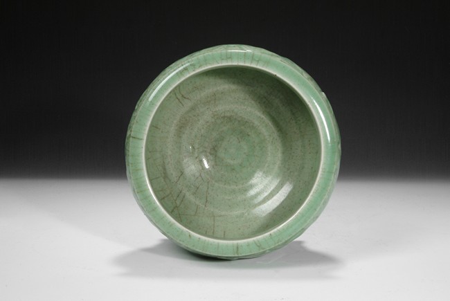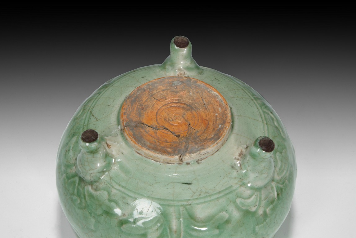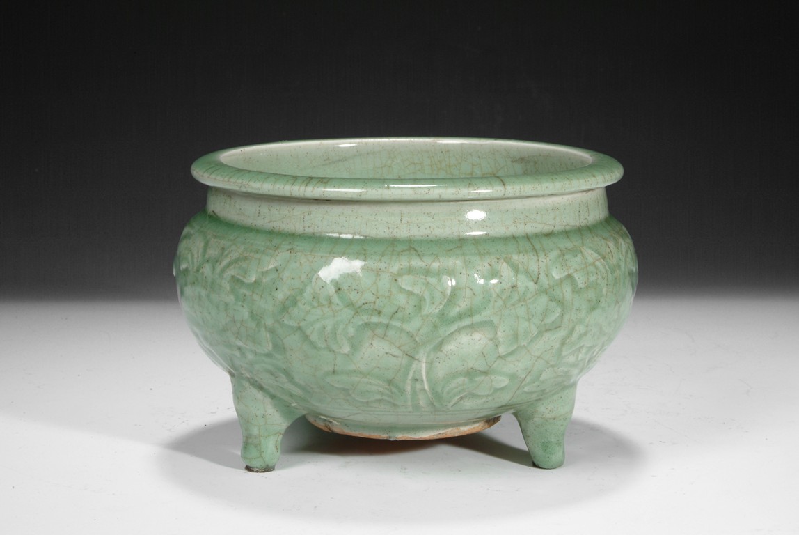 A Longquan celadon tripod censer with carved flower patterns on the exterior of body. The glaze on the whole censer is finely crackled, typically result from the use and age. Qing Dynasty period.