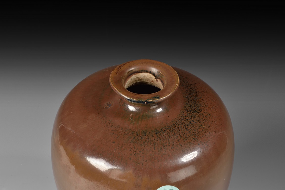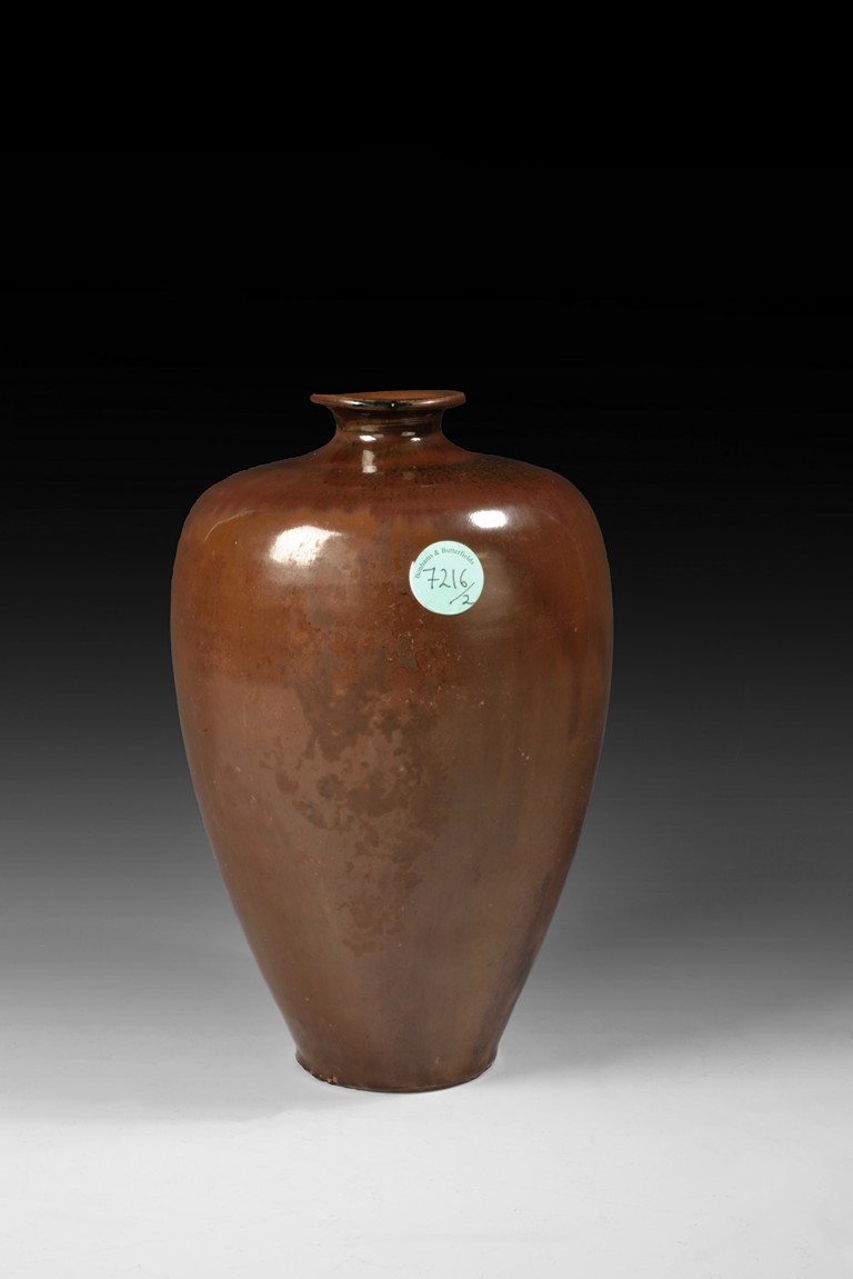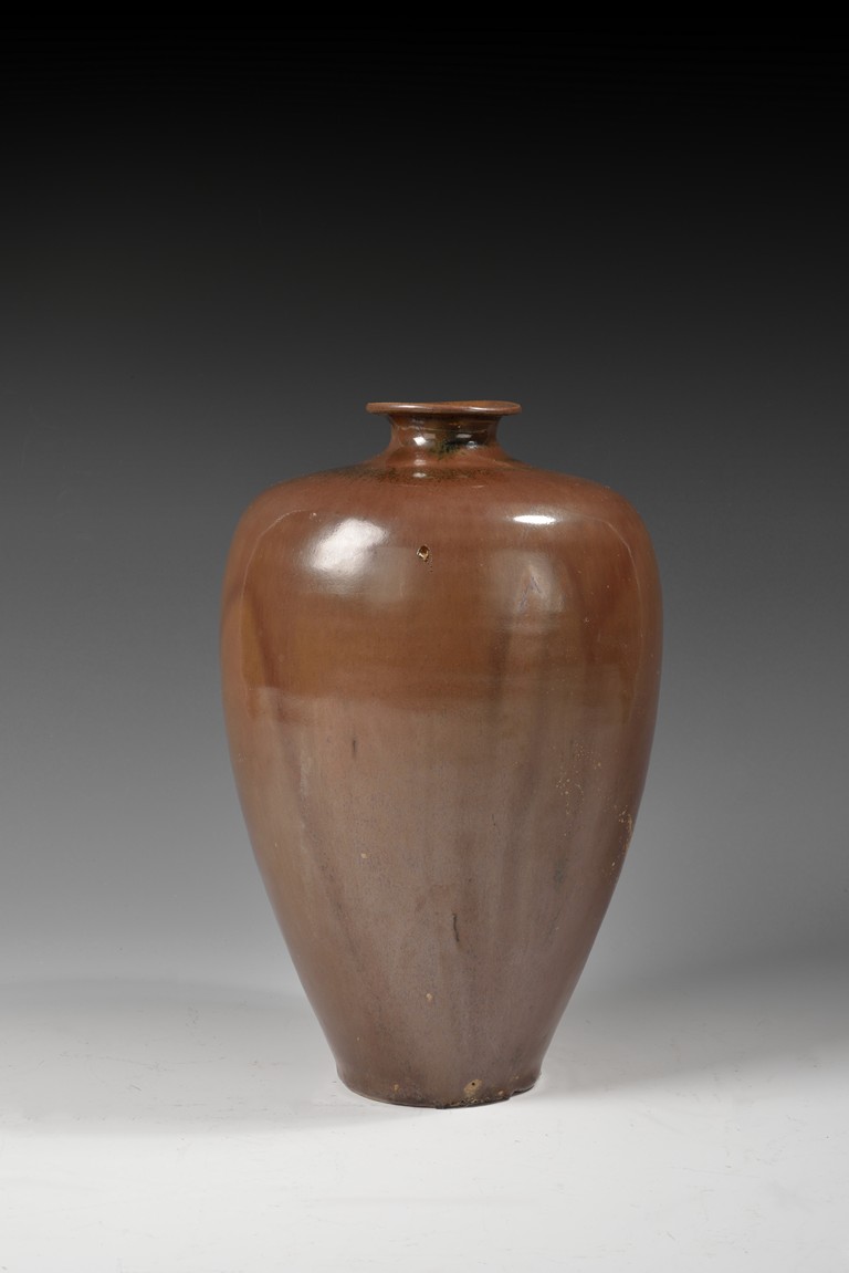 600 The vase is covered overall with a soy sauce colored glaze. The shape is of meiping, with elegant ovoid body, broad rounded shoulders, short neck, and rolled rim. The footring unglazed revealing some burn marks. Song Dynasty period.