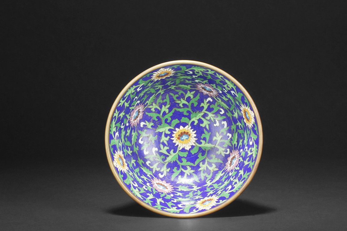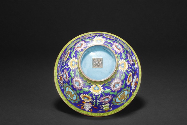 The bowl enameled with blossoming flowers, vines, and leaves, the exterior with four roundels, each enclosing a Chinese character symbolizing longevity, surrounded by ruyi-head patterns, over blue ground, the rim and base with scrolling key-fret patterns. Bottom bears four character 'QIANLONG' mark.