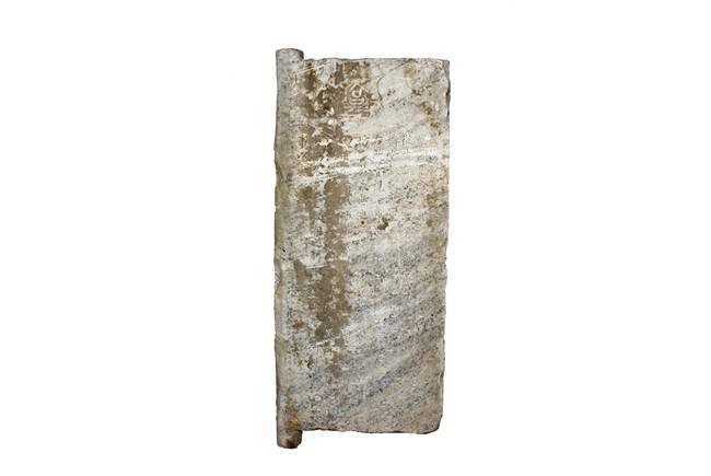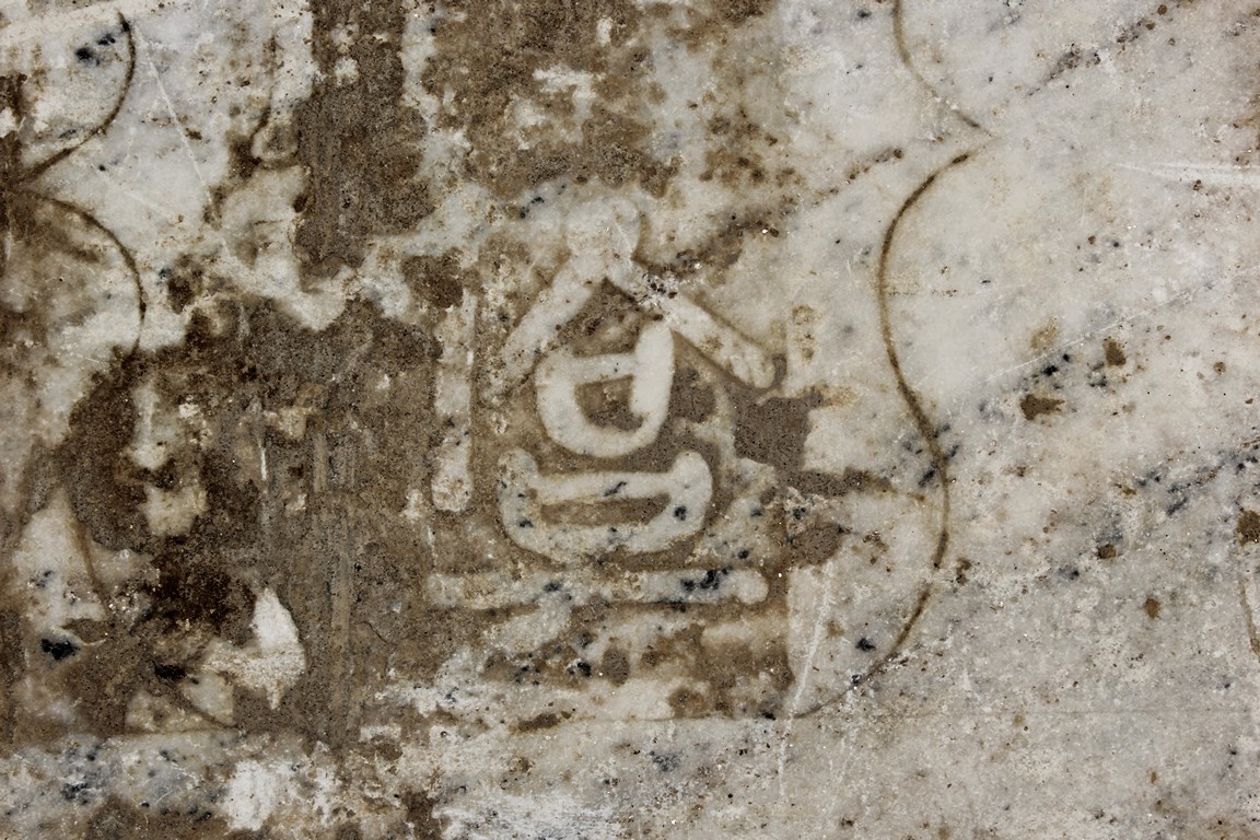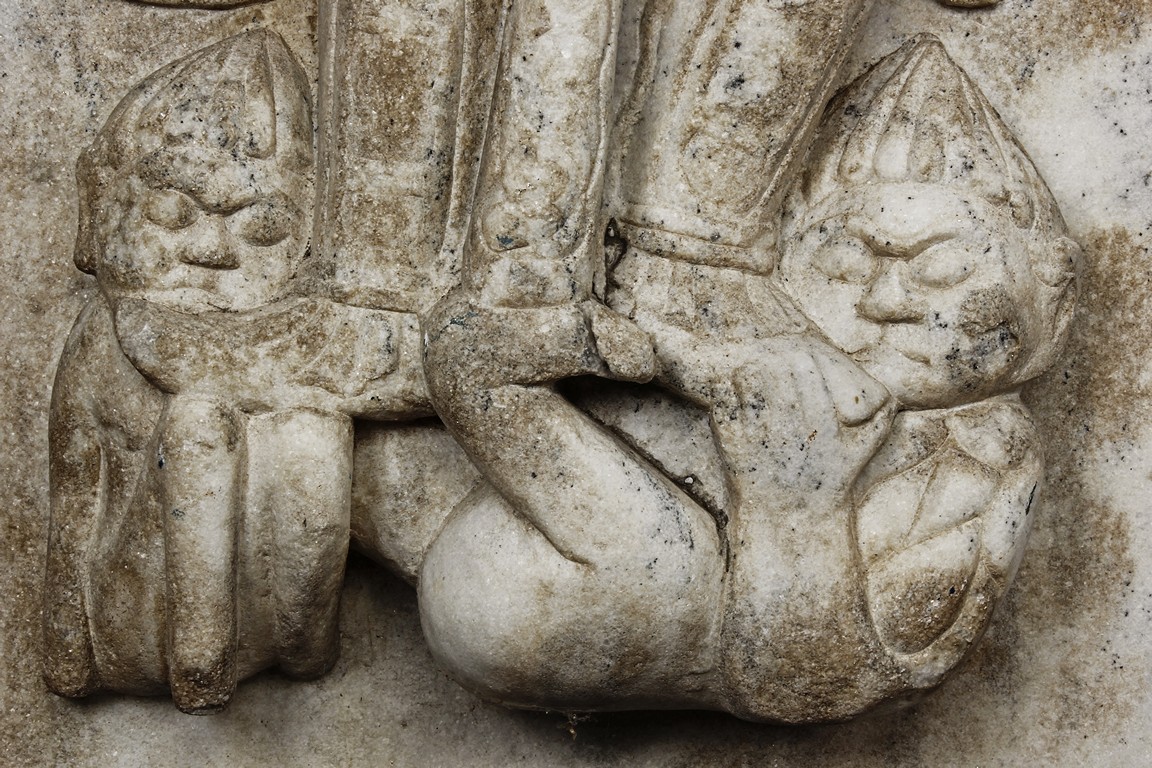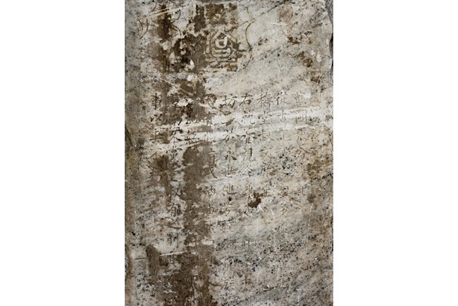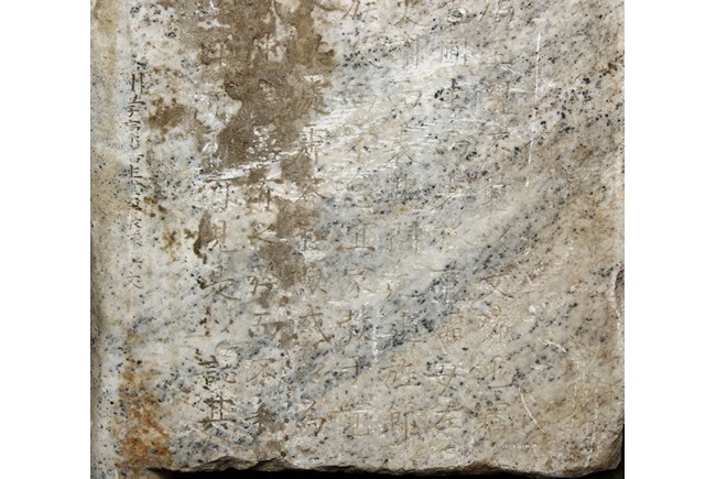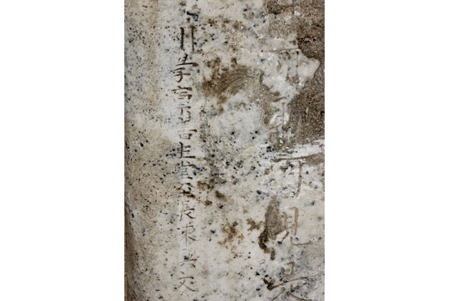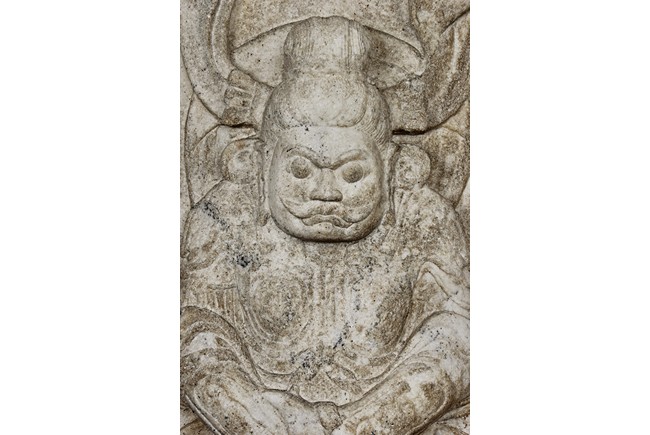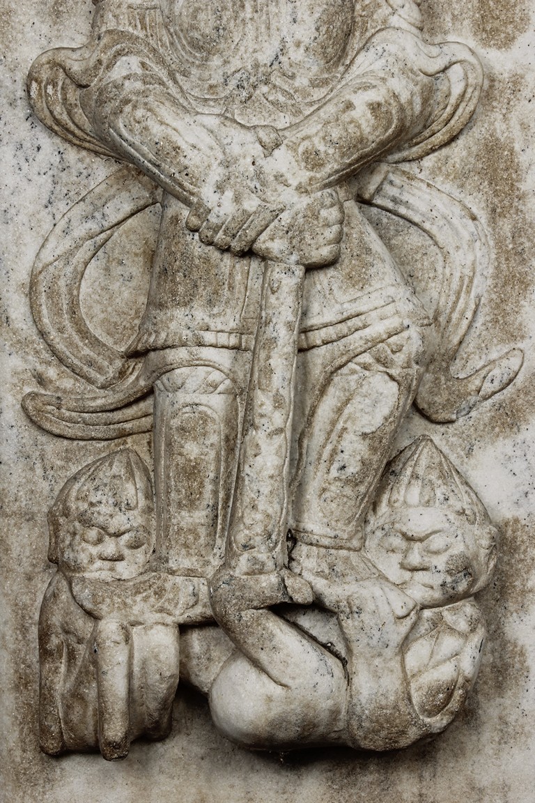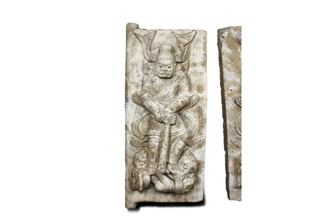Each marble stele is carved with a standing guardian in relief, supported by two attendants, while holding a sword with both hands clasped together, face depicted with a stern expression and wearing armor with flowing sashes, the head backed by a halo. One stele's back has Chinese inscriptions.