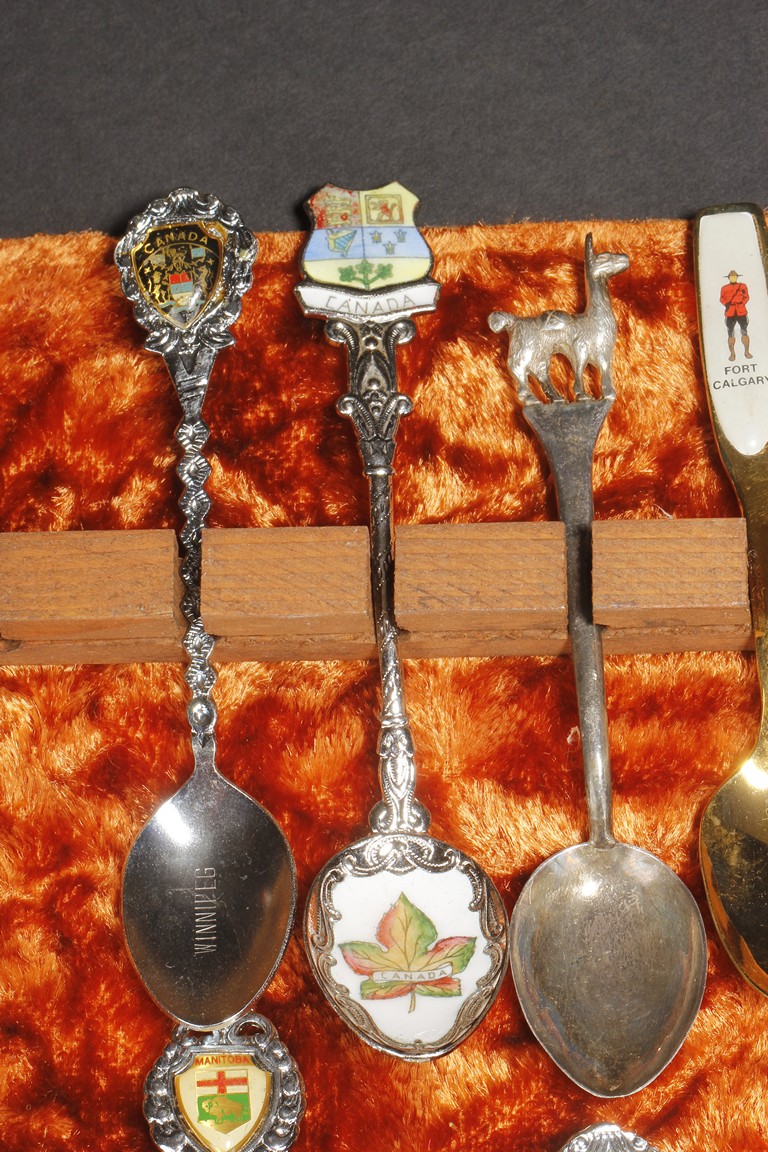 This box contains a set of 30 silver spoons, each with different size, shape, and design theme. Many bear marks on the end, including Canada, Montana, and fort Calgary, etc. Majority of these spoons were of the Canadian origin.